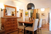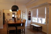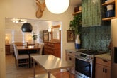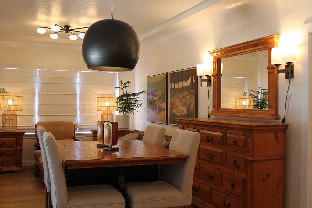This artfully appointed apartment is freshly renovated with brand new appliances, plumbing fixtures, flooring, and decorations. The approximately 890 square foot unit is in a classic art deco / Spanish colonial style duplex bungalow with preserved original architectural details. The apartment features a spacious living and dining room connected with an oversized kitchen and laundry room. Also included are two bedrooms with closets, one bathroom, a small private patio behind the unit, and one parking space. We are excited to offer this freshly renovated and fully furnished apartment in a charming and classic bungalow duplex in Los Angeles, close to Figueroa St in the trendy Highland Park neighborhood. All fixtures, flooring, and appliances are brand new, and are complemented by solid wood furnishings and a curated collection of art and decorations. All rooms in the apartment enjoy ample natural lighting through oversized windows. The Kitchen features solid wood cabinets, authentic Saltillo floors, granite countertops, green tile backsplashes and exhaust hood, exposed butcherblock shelves and small appliance cupboards, and a special oversized Moon pendant light. The kitchen comes equipped with a full stainless-steel refrigerator with in-door water dispenser, gas range, microwave, dishwasher, stainless-steel island, pots and pans, dishes and glassware, and serving dishes. Connected to the kitchen is an oversized laundry room with brand new Washer and Dryer plus ample counter and storage space. The Kitchen opens onto the oversized great room with original Art Deco plasterwork and built-in curio displays. The great room includes Living and Dining areas featuring wood flooring, solid wood furnishings, and black iron light fixtures. The Living area includes upscale tan leather seating, authentic Mexican side tables, and rattan statement lamps. The Dining area includes a counter-height dining table with four chairs and built-in storage, surrounded by the original Art Deco bay window with built-in display nooks. The Bathroom boasts brand new terrazzo-style hexagon floor tiles, rojo quarry tiled walls, frameless glass shower with rainfall showerhead, and solid wood vanity cabinet with illuminated mirror. These fixtures and finishes are complemented by a collection of raffia and rattan bowls and vessels. The Primary Bedroom includes a grand Mexican solid wood queen bed, dark wood vanity cabinet and writing desk, plus a full closet. The Secondary Bedroom, which can be rearranged as an office space per request, includes a full bed with ample storage, Art Deco burlwood dresser, and full closet.