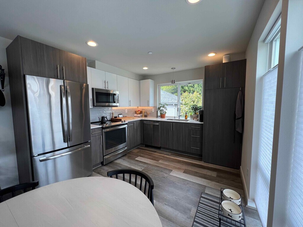 New end unit townhouse on Ballard/Phinney line built in 2020. 2 bedrooms, each with en suite bathrooms, flexible office space or 3rd bed, eat in kitchen with new stainless steel appliances, washer, and dryer. Two mini-split air cooling units, balcony with city views, and covered assigned parking. 2 min. from express bus downtown. Walk to Ballard center and breweries. Great location at 8th and 65th with access to neighborhood bars and restaurants.