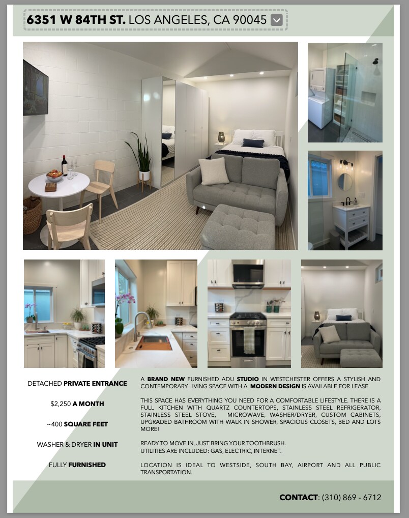 A newly built furnished ADU studio in Westchester offers a stylish and contemporary living space with a modern design. This space has everything you need for a comfortable lifestyle. There is a full kitchen with quartz countertops, stainless steel refrigerator, stainless steel stove, microwave, custom cabinets, upgraded bathroom with a walk in shower, spacious closets, queen bed and lots more! Ready to move in, just bring your toothbrush. Utilities are included: GAS, ELECTRIC, INTERNET. Location is ideal to Westside, South Bay, Airport and all Public transportation.