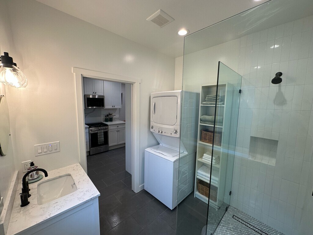 A brand new furnished ADU studio guest house in Westchester offers a stylish and contemporary living space with a modern design. This space has everything you need for a comfortable lifestyle. There is a full kitchen with quartz countertops, stainless steel refrigerator, stainless steel stove, microwave, washer/dryer, custom cabinets, fresh bathroom with walk in shower, spacious closets, bed and lots more! Ready to move in, just bring your toothbrush. Utilities are included (gas, electric, internet). Plenty of street parking. Location is ideal to the Westside, South Bay, LAX and all public transportation. The guest house is detached from main house with a private gated entrance.