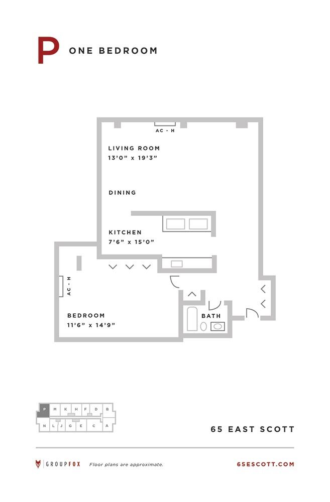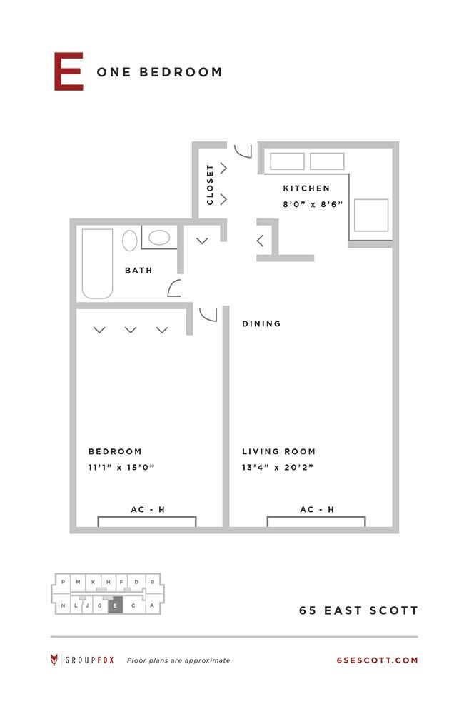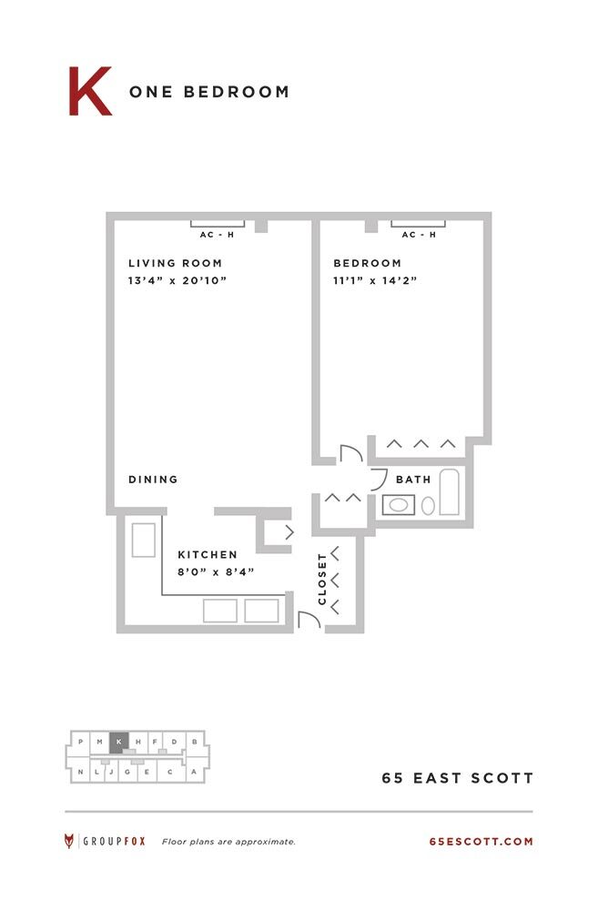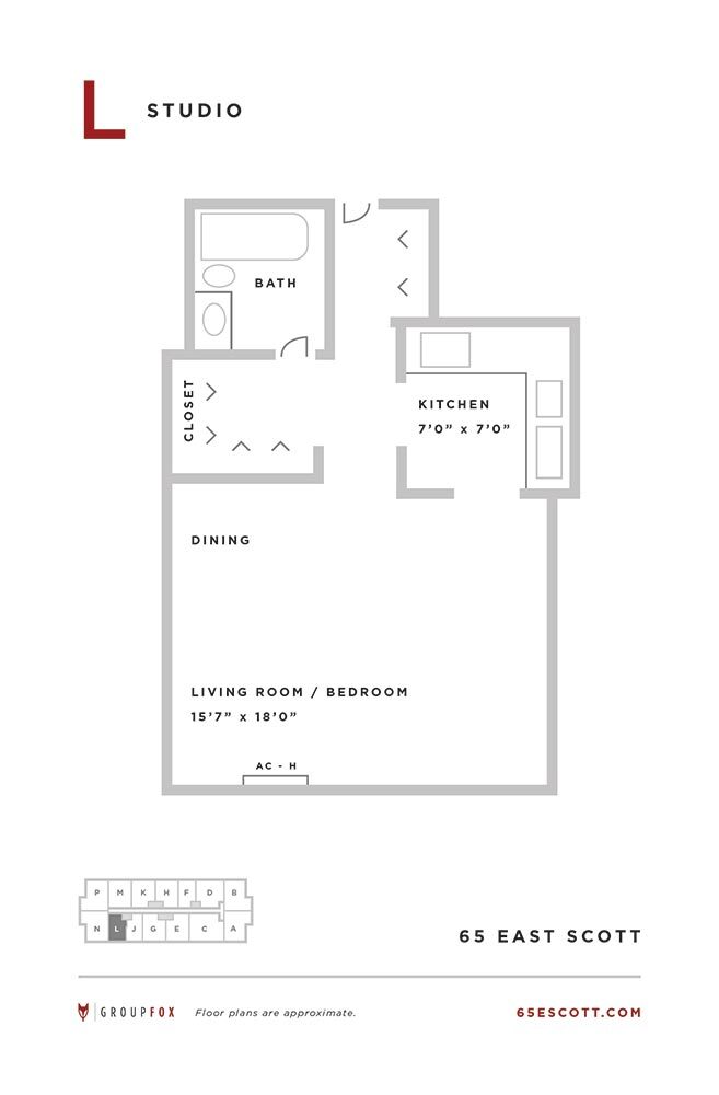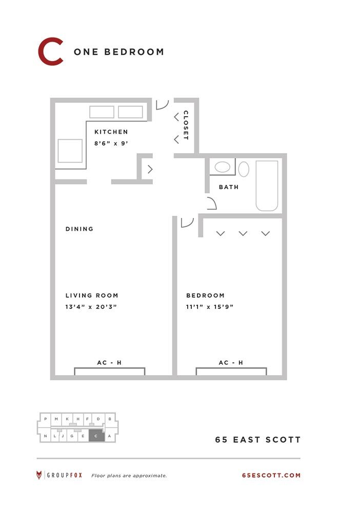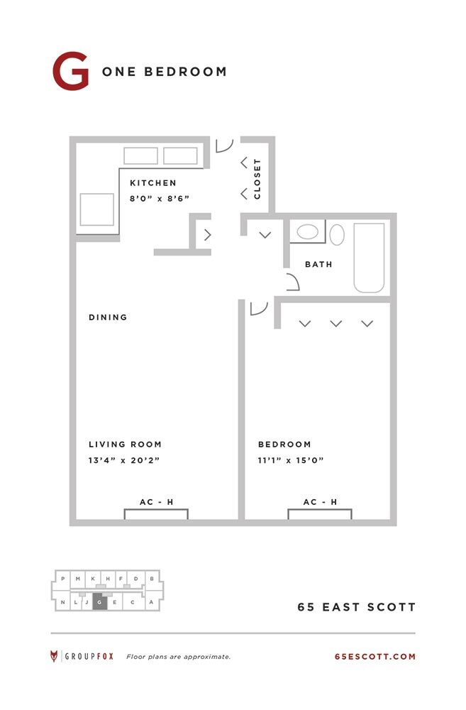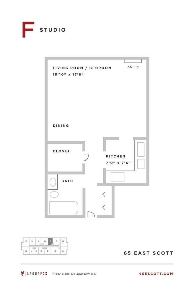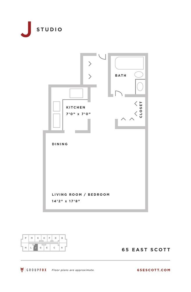 65 East Scott offers Studio to 2 Bedroom apartments starting from $1,715 and having 486–1,031 sq ft. Here is the current pricing and availability: