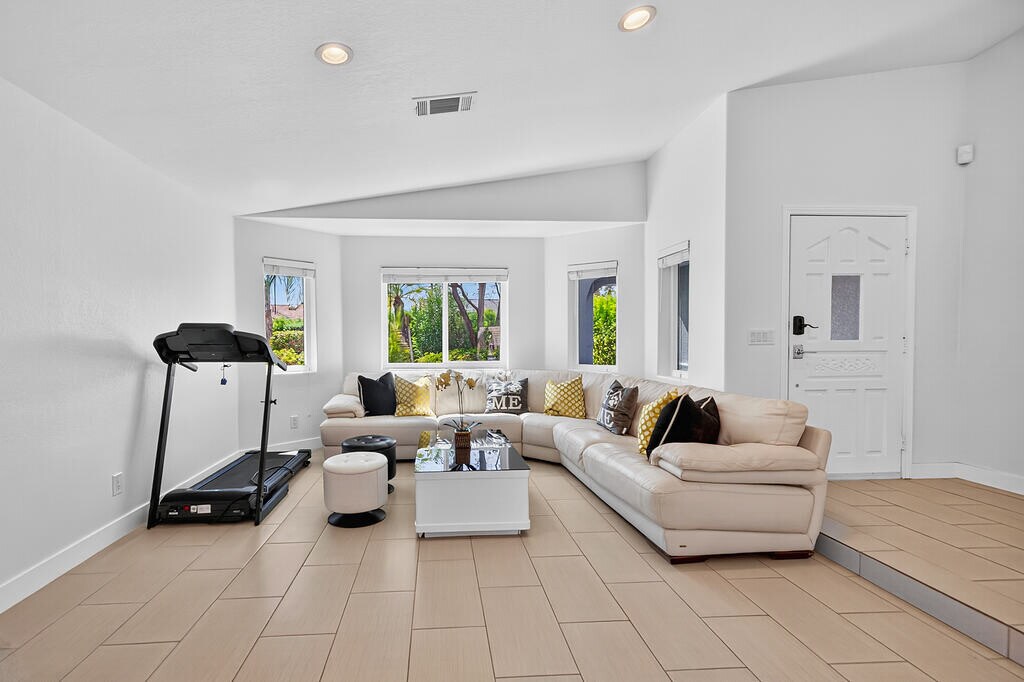 Fully furnished and beautifully remodeled, this 3-bedroom, 2-bath single-story pool home in Cathedral City offers the perfect blend of comfort and resort-style living. Step inside to a spacious high-ceiling living room furnished with couches, a coffee table, bean bag loveseat, dining set, and treadmill. The family room, complete with additional couches and a coffee table, flows seamlessly into the chef’s kitchen, which is truly the heart of the home. The kitchen boasts glossy lacquer cabinetry, an oversized island with seating, a built-in range, double oven, microwave, dishwasher, refrigerator, and is fully stocked with every dish and utensil you could need—ideal for both everyday living and hosting gatherings. The primary suite is a relaxing retreat with dual closets, direct access to the backyard, and a spa-inspired bathroom featuring double sinks, a soaking tub, tiled walk-in shower, and private water closet. Two additional bedrooms are comfortably furnished with beds, nightstands, and ceiling fans, and share a remodeled walk-in shower bathroom. Flooring includes tile throughout the living areas and laminate wood in the bedrooms, along with a separate laundry room offering cabinetry and a sink for added convenience. The backyard is designed for entertaining and relaxation, featuring a sparkling pool and spa, outdoor dining area with BBQ and flat grill, cozy seating around the fire pit, two egg chairs, four lounge chairs, a hammock, and an expansive dog run. The front yard is lined with mature trees providing privacy and tranquility. A two-car garage is available for tenant use, with the third bay reserved for owner storage. Located on a quiet street just minutes from I-10 and only 15 minutes from Downtown Palm Springs, this home is close to Agua Caliente Casino, Desert Hills Premium Outlets, golf courses, and world-class dining and shopping. With its furnished interiors, upgraded finishes, and entertainer’s backyard, this home is ready to be enjoyed from day one.