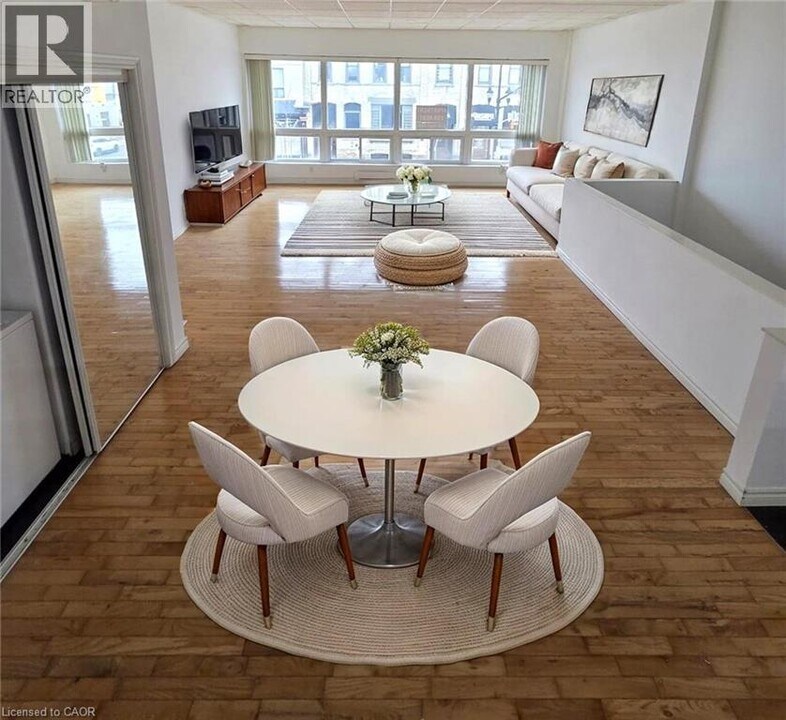 A BRIGHT LOFT IN THE HEART OF UPTOWN WATERLOO. Right in the centre of Uptown Waterloo,above the rhythm of King Street,sits a spacious and bright one-bedroom apartment that feels more like a private loft than a typical rental. Tucked above the storefronts at 7 King Street N,this home offers a rare combination of character,space,and natural light in one of the city’s most walkable locations. Step inside and the first thing you notice is the openness. The living and dining area stretches wide beneath high ceilings,with large windows that pour in natural light and frame views of the historic streetscape below. Warm wood floors run throughout the space,giving the home a relaxed,welcoming feel. The kitchen sits just beyond,designed with generous cabinetry,plenty of counter space,and a large island. Further inside,the bedroom offers a comfortable retreat with room to truly settle in,while the full bathroom provides a classic layout with tub and shower. A second powder room adds everyday convenience,and in-suite laundry makes the space as practical as it is charming. Living at 7 King Street N means stepping outside to some of Waterloo’s best cafés,restaurants,shops,and transit,while still enjoying the privacy of a quiet apartment above it all. Available Immediately. (id:63800) ID#: 1750694