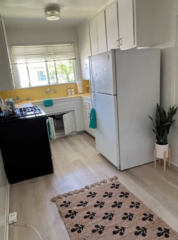 This spacious upstairs unit in the 709 building overlooks the greenbelt between the 707 building and 709 building. A corner location, there is lots of natural lighting from outside. The entire unit has new wood blinds. Enter the living room with refinished hardwood floors, the kitchen/dining area on left. The living room has a large coat/storage closet. The unit is warmed by a newer wall furnace and cooled by window a/c units and ceiling fans. The kitchen maintains the 50's retro look with its yellow ceramic tile, some drawers replaced and new kitchen/dining room flooring. An updated gas range and a refrigerator is supplied. The bathroom is completely remodeled with new flooring, shower/bath tile, fashionable vanity, mirror and medicine cabinet. The hall outside the bathroom has amazing storage with clothing closet, cabinets and shelves. A very large bedroom has windows on side and front to give it an open airy feeling. There is a walk-in closet in the bedroom. Water and trash are included, also includes an assigned parking spot in the back. The on-site laundry facility has (2) coin operated washers and (2) driers. Everybody loves this unique, safe location with a community park in walking distance, 10 minutes to the Glendale Galeria and Americana where there is shopping, great restaurants and entertainment. Also, near are Griffith Park and freeways to all directions. NO SMOKING - cat would be considered. $2,000/month, $2,000 deposit, 1 year lease required.