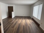 Bright room two bedroom one bath apartment in a six plex with garage included in the rent. 900 square feet. Open floor plan, balcony, and coin op laundry on site. Great location on west end. Tenant pay electricity (including heat) and water. Management pays trash removal, lawn care, snow removal.
