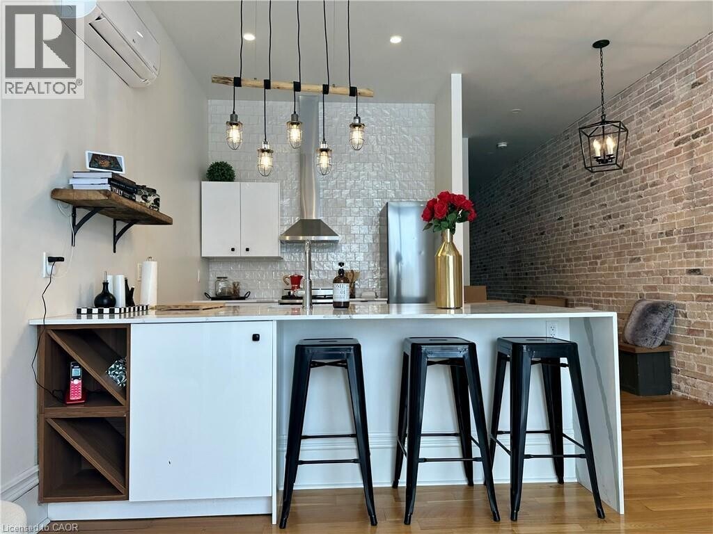 Experience refined riverside living in this stunning,fully renovated 1 bed + den residence set along the banks of the Grand River in the heart of a charming,walkable town. From the moment you enter,the building makes a statement featuring elegant tile work and a classic wrought-iron gated entry that sets the tone for what’s inside. The suite itself is flooded with natural light and seamlessly blends timeless character with modern design. Exposed brick and rich hardwood flooring are paired with a sleek,contemporary kitchen complete with white cabinetry,stainless steel appliances,and a striking waterfall quartz island designed for both everyday living and effortless entertaining. The living room offers a warm,inviting atmosphere with a gas fireplace,while oversized sliding doors extend your living space to a private balcony. A dedicated dining area,a spacious bedroom with generous closet space,and a versatile den with a gas fireplace to create the ideal layout for professionals or anyone working from home. All-inclusive living elevates the experience even further,with utilities and internet included,plus one parking space. Available furnished or unfurnished to suit your lifestyle. (id:63800) ID#: 1750685