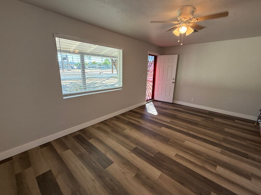 COMPLETE REMODEL ALMOST READY! This beautifully remodeled 3 bedroom, 2 bathroom home offers a perfect blend of modern design and everyday comfort. The property features a spacious master suite with a walk-in closet, a brand-new kitchen with a gas stove and refrigerator. Both bathrooms are complete remodels. Fresh paint, new flooring, and energy-efficient double-pane windows enhance the contemporary feel, while ceiling fans and a brand new 3 ton HVAC unit ensure year-round comfort. The home also includes a separate laundry room with washer and dryer hookups, a large shaded backyard with covered patio, and an extended driveway for ample parking. A mature tree in the front yard provides additional curb appeal and natural shade. Conveniently located in a central neighborhood with easy access to shopping, dining, and freeway, this home will be move-in ready soon and will be ideal for tenants seeking style, comfort, and convenience.