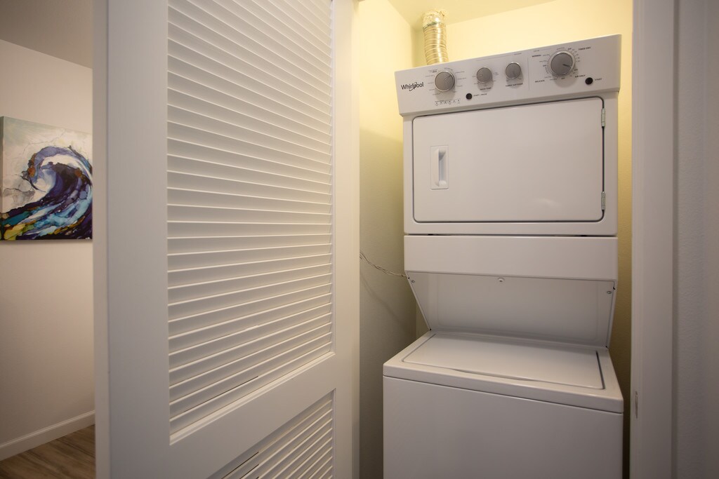 - Stacked, full-size washer and dryers