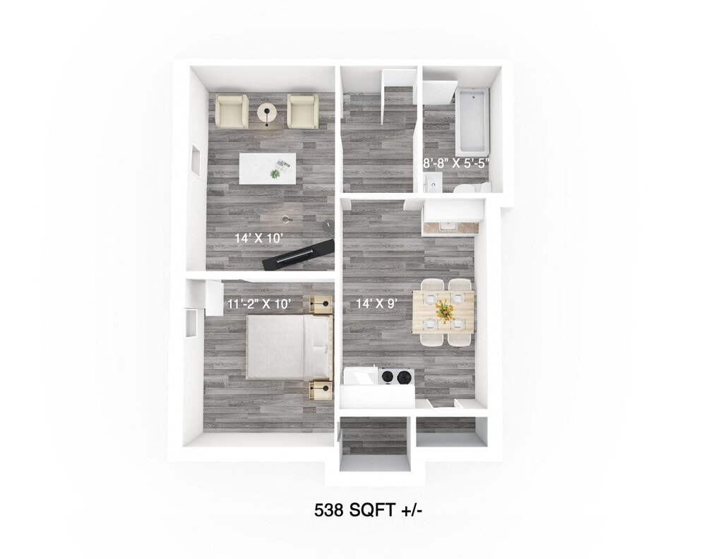 1 Bed, 1 Bath, 538 sq ftAvailable January 1, 2026Largest 1 BedroomThis is the largest 1 Bedroom at this PropertyModel Gallery