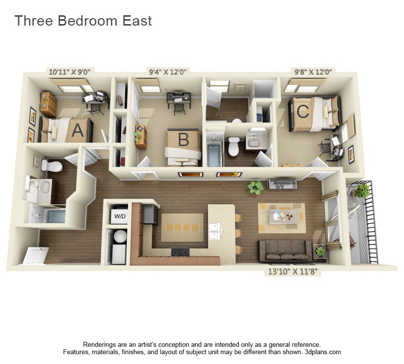 3 Beds, 3 Baths, 984 sq ftAvailable Aug 17, 2026Largest 3 BedroomThis is the largest 3 Bedroom at this PropertyModel Gallery