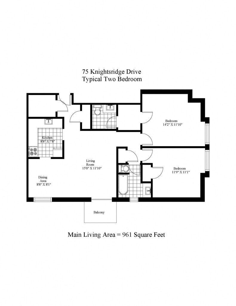 Apartment Model: Two Bedroom Two Bath2 Bedroom, 2 Bath, 961 sq ftUnavailableTwo Bedroom Two Bath - Floorplan 1