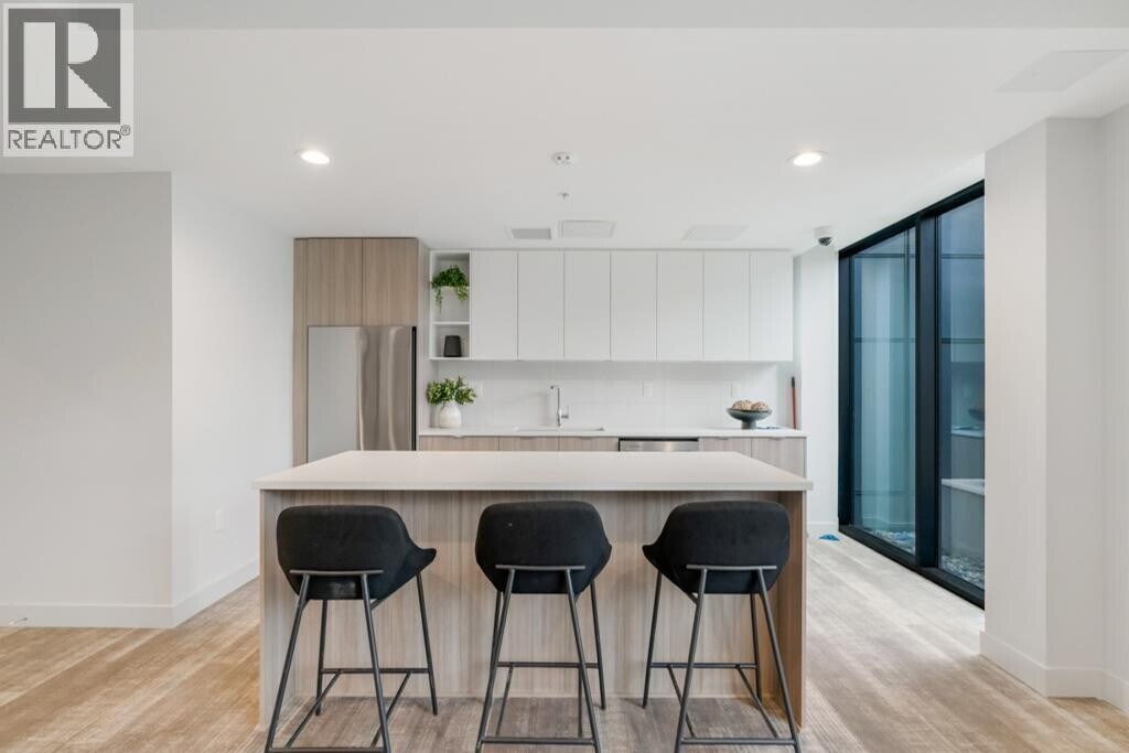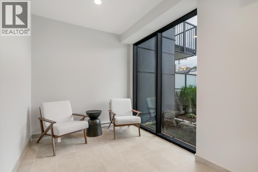 This 692 sq.ft. 1-bedroom + flex,1-bath ground-level home offers rare street access through a large 202 sq.ft. concrete patio with a gas outlet,black metal gate,small covered entry,and space for a barbecue and multiple seating areas. Inside,the spacious living and dining room features two large windows facing the patio. The full-size gourmet kitchen includes two-toned cabinetry,a long serving counter with breakfast bar,accent shelves,stainless steel appliances,a gas cooktop,and stone countertops. The bedroom also overlooks the patio,includes two closets,and has direct access to the 4-piece bathroom with quartz counters and a frameless glass soaker tub. A generous flex room works well as an office or pantry. One parking and one locker included. (id:52069) ID#: 1943002