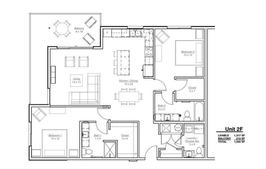 2F - Floorplan 1 Apartment Unit: 2003Apartment Model: 2F$2,3002 Bedroom, 2.5 Bath, 1317 sq ftAvailable January 23, 2026Floorplan 2E