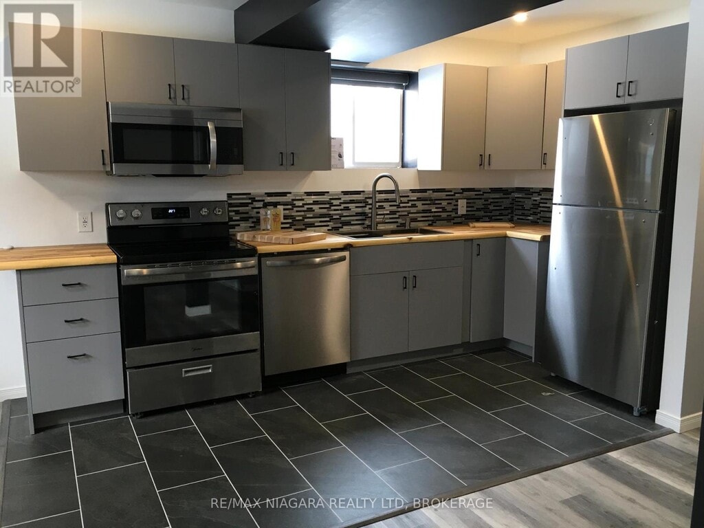 This Modern 1 or 2 Bedroom Lower Level Unit has Private Side Entry and is Newly Renovated Bright and Clean! Open Concept Living Area features Above Grade Windows,allows lots of light,New Vinyl and Tile Floors and a sparkling New Kitchen with amazing Butcher Block counters. Four NEW Stainless appliances and on tap R.O. Water.The main Bedroom Area is a Spacious,Peaceful Escape and perfect for the light sleeper or shift worker. It has a flexible design lay out as a King Sized Bedroom with a Large Walk in Closet that can be used as a Den,Office,Gym or 2nd / Guest Bedroom. This unit has in suite private Laundry Facilities,On Site Storage available,includes outdoor Lawn Maintenance and Snow removal and there is really no better option for a Single,Empty Nester or Seniors. Maintenance Free Living with a House and Yard! The owner is even planning a large deck,hot tub,BBQ Pit and landscape for the backyard. The Home has High Ceilings,Sound Deadening Insulation throughout and Black Out Blinds,Paved Parking,Forced Air Heat and Central Air Conditioning. Resort Like - Fresh and Healthy Whole Home Soft Water and Alkaline Water on Tap.The wide Pie shaped lot is mostly privacy fenced and the Property is perfectly situated at the back end of a quiet,low traffic Crescent. A newer subdivision located in the North End of Niagara Falls and conveniently close to highways,shopping,bakeries and banks,walking paths and fantastic Alpine Park ! The only other tenant in this building is the owner,a single Day worker who will occupy one of the only two units and looking for a tenant/s who appreciates a little peace and quiet. In addition to rent Tenant pays 1/2 utilities and rent includes lawn maintenance and snow removal. Add $53/mo for ensuite laundry machines,Add $100/mo for access to storage in Attached Garage,Add $100/mo for Steel Storage Container (13x7 - better than self storage unit and it is right on site) (id:52069) ID#: 1500977