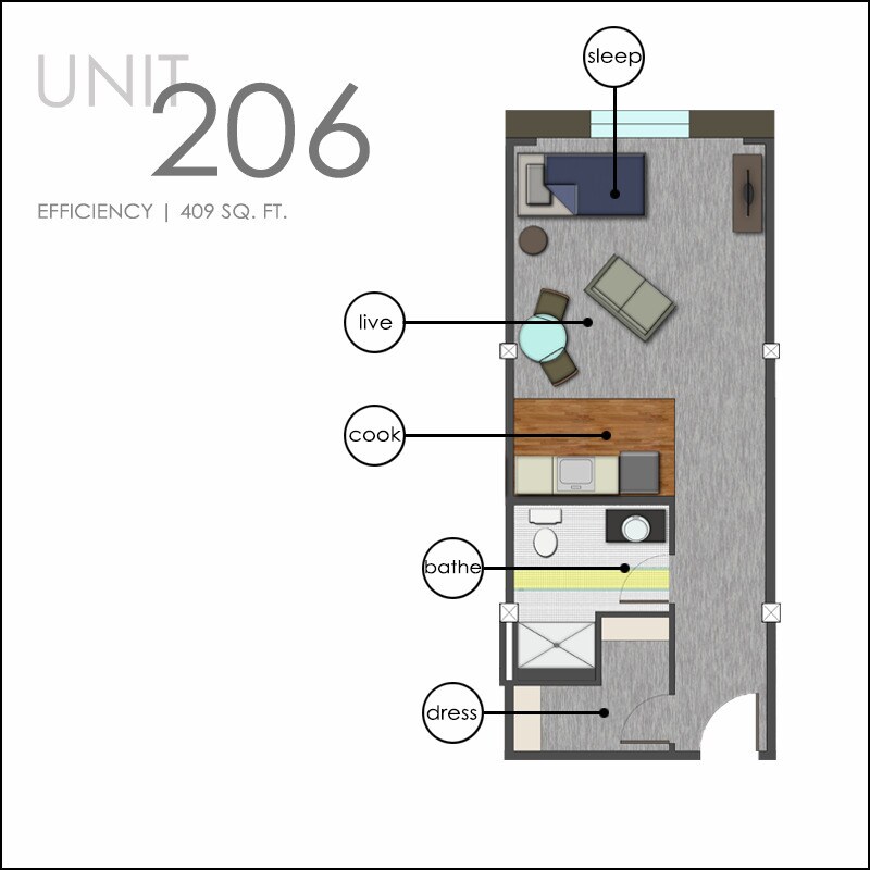 Apartment Unit: 206Apartment Model: Small Studio$725Studio, 1 Bath, 425 sq ftAvailable Now$725