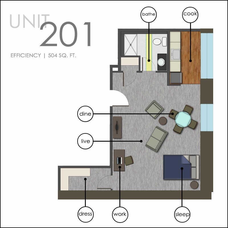Apartment Unit: 304Apartment Model: Small Studio$725Studio, 1 Bath, 425 sq ftAvailable Now