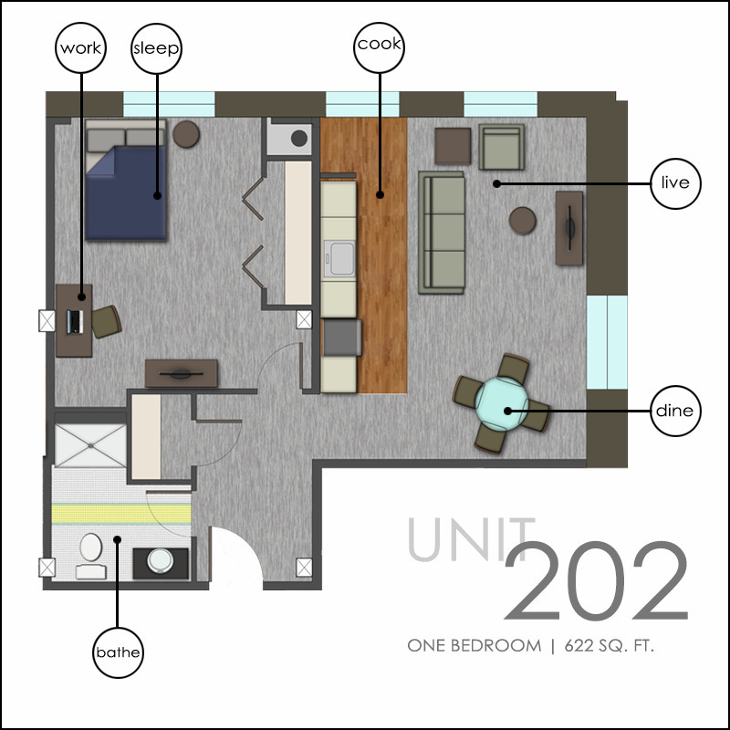 Apartment Unit: 309Apartment Model: Large Studio$825Studio, 1 Bath, 525 sq ftAvailable Now$725