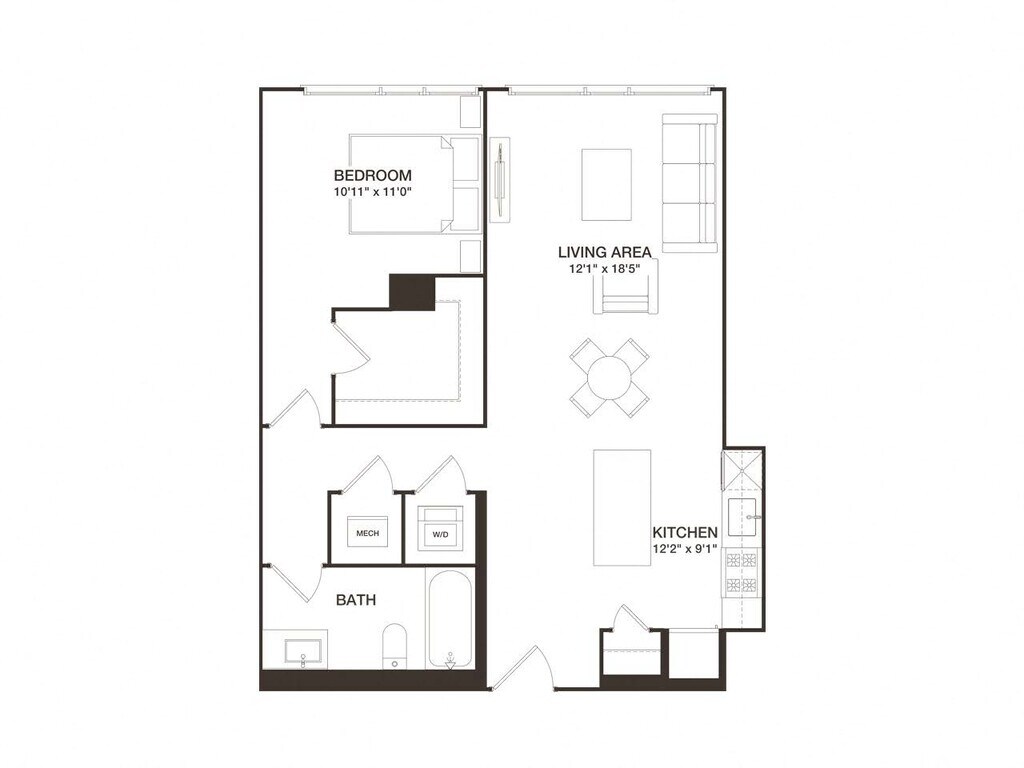 Apartment Model: 1 Bed - 1 Bath | A01From $2,5811 Bedroom, 1 Bath, 736 sq ftAvailable April 16, 2026Floor plans are artist's rendering. All dimensions are approximate. Actual product and specifications may vary in dimension or detail. Not all features are available in every rental home. Please see a representative for details.
