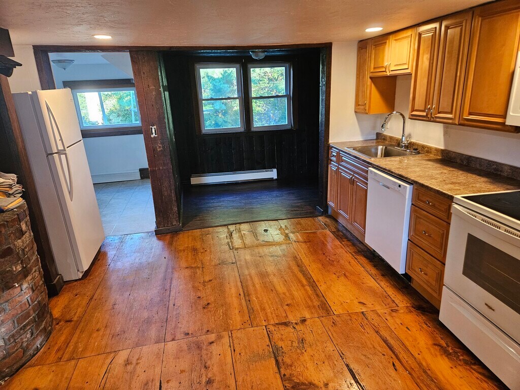 This 3 Bedroom apartment has had the following things done in preparation for listing: Freshly painted throughout entire apartment(ceiling, walls, trim, radiators etc). New Carpets installed throughout. Living room ceiling fan replaced Exterior patio renovated 1 bedroom has hardwood floors and walk in closet, Both other bedrooms have good sized closets, upstairs bedroom has built in drawer storage also. Kitchen has large plank antique hardwood floors. There is an office/large pantry type space off of the kitchen as well as an eat in kitchen area for small breakfast table. Bathroom and office areas off kitchen are vinyl plank flooring. There are 2 bedrooms on the first floor, each off of one of the living rooms and there is a bedroom up a set of stairs off of the living room on the second floor. This apartment has a double living room large decorative (non functional, will not be permitted to light fires) brick fireplace, antique post and beam living spaces, this house was built in the late 1700's, antique farm house look. There is a patio area accessible from a sliding door just off of one of the double living room areas. There is a covered wrap around front porch/patio area in front of this apartment. This apartment is on about 1.5 acres of shared land with a large grass side yard next to the patio for outdoor living/entertaining space tenant will have up to 3 parking spaces included, with more exterior storage if necessary available at additional cost. All of the windows are vinyl replacement double pane insulated windows. Heat is baseboard water by gas in basement Hot water is gas hot water tank in basement This is a non smoking apartment No Dogs, 1-2 cats with deposit other pets ask first Owner manages landscaping, snow removal, water, septic maintenance. Tenants handles gas bill, electric bill, trash removal and other utilities(internet, phone etc). First/Last Sec and background/credit screening required There is on site coin op laundry room across the hall from the kitchen door of this unit, tenants in this unit do not have to go outside to access the shared laundry room. Kitchen range is smooth top electric range, over the range microwave, refrigerator are provided. Due to septic/plumbing constraints there is no dishwasher in this unit. Please contact for walk through showing, right now unit is having new carpet installed, painting being redone, will be available October 1st, showings being conducted while renovation by appointment. This is a large apartment, with a private entrance from the front to the outside, not a shared entrance. 4 Minute drive to local commuter rail in Whitman, closet to Route 18, Tri Town Gas station area etc. please reach out with a cell phone number if possible, thank you.