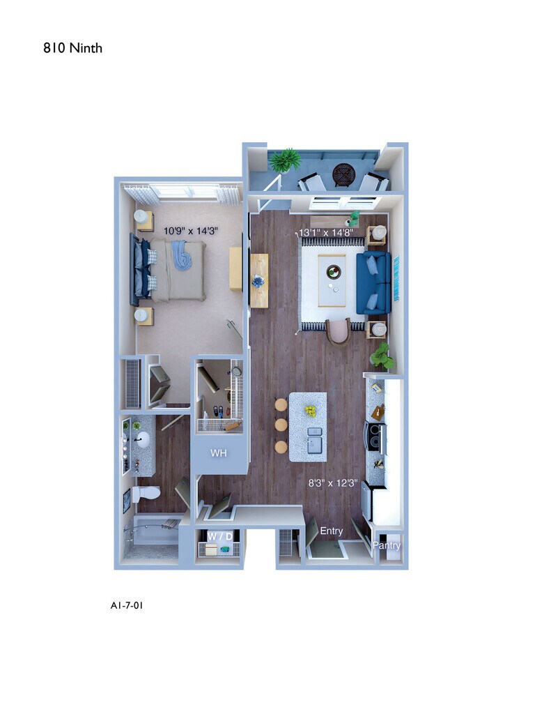 810 Ninth offers Studio to 3 Bedroom apartments starting from $1,630 and having 518–1,437 sq ft. Here is the current pricing and availability: