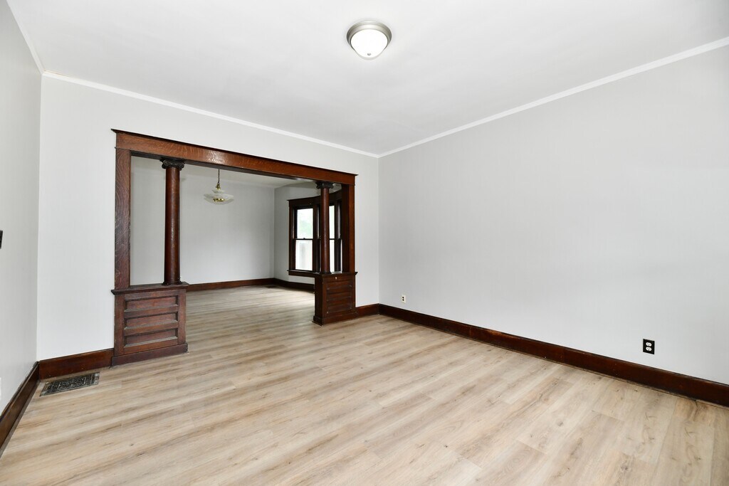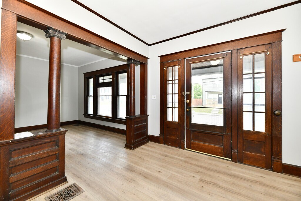 Discover the charming St. Clair neighborhood from the inviting covered front porch of this beautiful Craftsman home. Inside, you'll find stunning trim work, crown molding, exposed beams, and elegant window casings. This home features two spacious bedrooms, each with double walk-in closets! The updated full bath upstairs includes a large stand-up shower. You'll also appreciate the hardwood staircase that adds character to the space. Enjoy the brand-new kitchen, complete with all new appliances, along with a newly added half bath. The living room offers ample room for relaxation and entertainment, while the bedrooms provide comfortable sleeping areas. The bathroom includes a tub/shower combination and framed mirrors for added functionality. Additional amenities include heating, ceiling fans for climate control, and washer/dryer hookups for convenience. Additionally, there's a large unfinished basement for extra storage. The one-car detached garage is currently set up as a workshop or can be used as additional storage. The fenced backyard provides privacy and is a great space for outdoor activities.