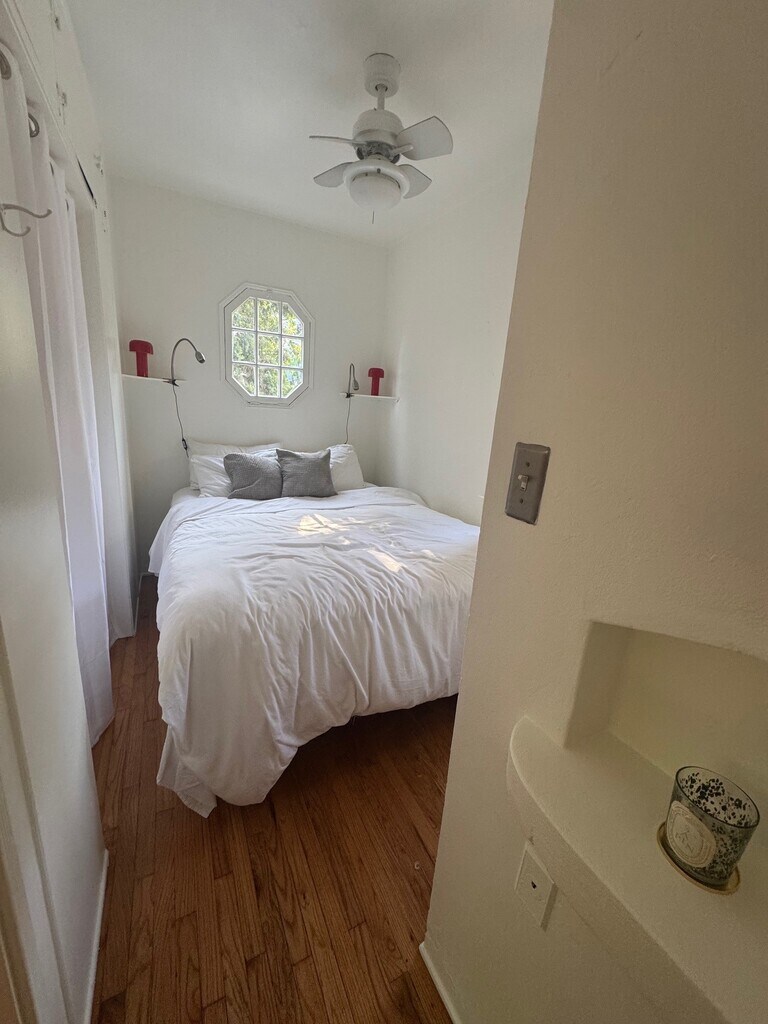 700 s.f. Guest House in the heart of Silverlake - available Oct 1,2025. Two blocks from Sunset / Silverlake Blvd and many restaurants, clubs, boutiques, galleries etc. Garden Charmer property located on private cul-de-sac with one dedicated parking space and private entry. Very quiet, airy and sunny guest-house (separate from the main house - no common wall) with trees and greenery out every window. Door of the studio opens on your own private patio (great for outdoor dinners, bbq, planting your herbs...) comes furnished, hardwood floors, full kitchen, refrigerator, stove, two AC wall units, washer and dryer. Internet, TV-cable and phone ready. Electricity and gas excluded. Studio comes with a catio - for one cat only. Please email for more details and to schedule a visit.