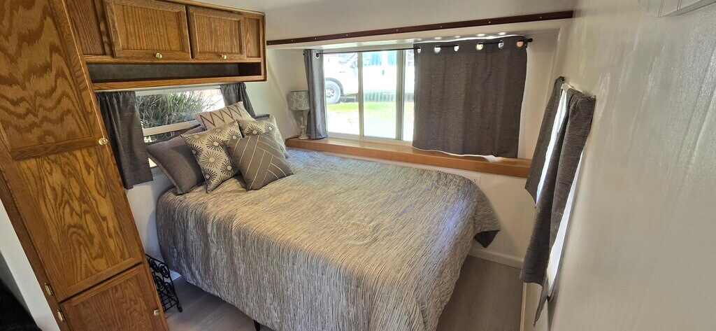 Beautifully refurbished trailer with lots of light from south-facing windows and a large skylight in the entry area ceiling that gives extra headroom. Recessed LED lighting illuminates the living area nicely. Newly upholstered pull-out sofa that converts into a bed with a large roll-out drawer underneath for storage. New full-size well-vented bathroom with glass-enclosed corner shower and marble-topped sink vanity, including built-in bathroom shelves and cabinets for ample towel and toiletry storage. 7'x2' built-in dining/office table made from solid ash wood. Includes a clean and comfortable full-sized bed, or bring your own (up to queen size) bed. Newly tiled cooking area countertop, and butcher block cutting board. All kitchen appliances, including a 3-burner gas stove, oven, microwave, and fridge/freezer, are clean and in good working condition. New waterproof luxury plank vinyl flooring 6'x3' slider dual pane windows over the bed and table areas. Storage includes a large pull-out drawer under the sofa, kitchen cabinets, a pantry cabinet, and space for plastic storage bins under the bed. Outside: two large cabinets on the patio and an exterior shelf set on the end of the front deck. Electric space heater and a portable AC unit, and shared laundry with other two tenants. Private 155 sq ft enclosed patio on the backside of the unit, and a covered deck in front with a bench. Parking for one car directly next to the entrance. Located in a peaceful setting on a redwood forested ridgetop, 5 minutes to Scotts Valley, 15 minutes to Santa Cruz, and 30 minutes to San Jose. Utilities are shared with two other tenants who live in the adjoining house. Averaged utilities include: - Electricity $30-$60/mo each - Internet 40MBPS download speed $40/mo each - Optional delivered drinking water at about $20/mo each. - Cooking propane refilled as needed. (2 tanks in unit) Great cell phone coverage and radio reception. Plenty of sunshine and potential small garden space. References and credit checks are required. Please respond with your phone number. First month's rent $1400 and cleaning deposit $1400= $2800to move in. Thanks