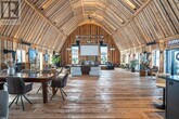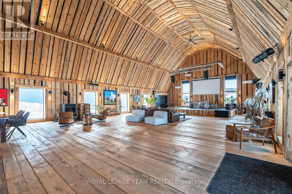 Unforgettable! A rare and remarkable barndominium offering monumental scale,moody elegance,and undeniable architectural presence. This extraordinary home reimagines barn chic through contemporary design,featuring a breathtaking Great Room with soaring domed ceiling,rich wood detailing,and dramatic lighting that create a cathedral-like atmosphere. A built-in stage with speakers transforms the space into an entertainer's dream,ideal for live music,gatherings,or celebrations. The kitchen is striking and refined,with sleek black cabinetry,gold hardware,and a large island with farmhouse sink. The Great Room also features a chic bar,wood-burning stove,and oversized garage-style doors for flexible indoor-outdoor flow. For luxurious rest: the main-level primary offers privacy and comfort,while a loft,two additional bedrooms,and beautifully finished full bath complete the upper level. Set on 100 private acres with walking paths,a stunning patio with barrel sauna,hot tub,and statement lighting. A truly once-in-a-lifetime rental opportunity. (id:52069) ID#: 1404338