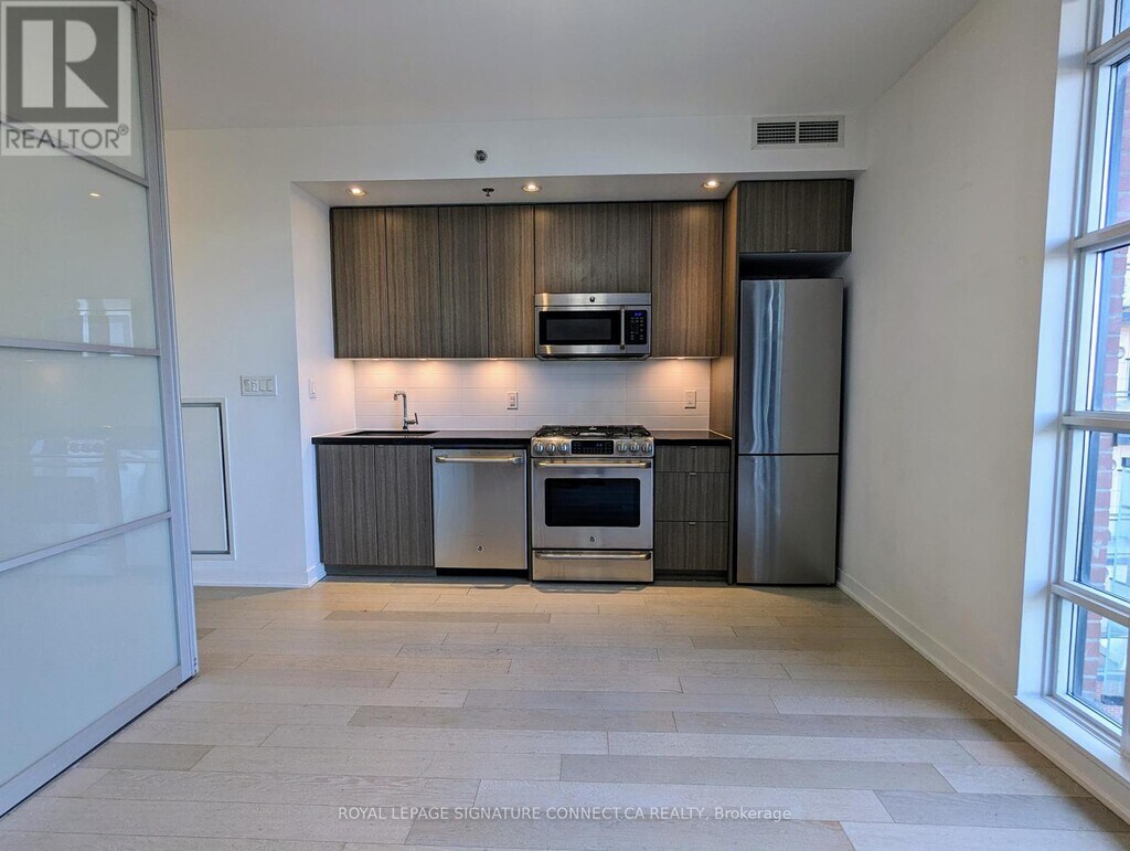 Bonus Parking Spot with the Unit! Step into this stylish loft-style 1-bedroom apartment where modern design meets character. Perfect for the single professional,it features exposed brick walls,a sleek kitchen with under-cabinet lighting,and built-in stainless steel appliances. Enjoy a private balcony overlooking a parkette,custom window coverings,a deep soaker tub,and in-suite laundry. Located in a vibrant neighbourhood with parks,cafés,and TTC at your doorstep urban living at its finest. (id:52069) ID#: 2194303
