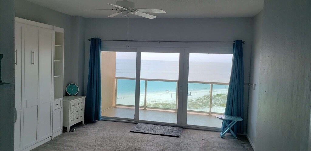 Steps to the sand! Beach-facing Studio at the Regatta Beach Club with big balcony overlooking the beach. Offered furnished with a Queen-sized Murphy bed and sofa set, kitchen utensils, crockery and cutlery. Minimum 3-months lease. Living room and balcony have spectacular 180’ views of the Gulf of Mexico. Regatta Beach Club has state of the art Gym, Swimming pool, Game-room, and entertainment Media-room on-site. The tenant may use these as the rent includes usage of all common area facilities and parking. Please note that this unit is being priced competitively to reflect the hurricane repairs being undertaken in the building. Short walk from Pier 60, restaurants and stores.