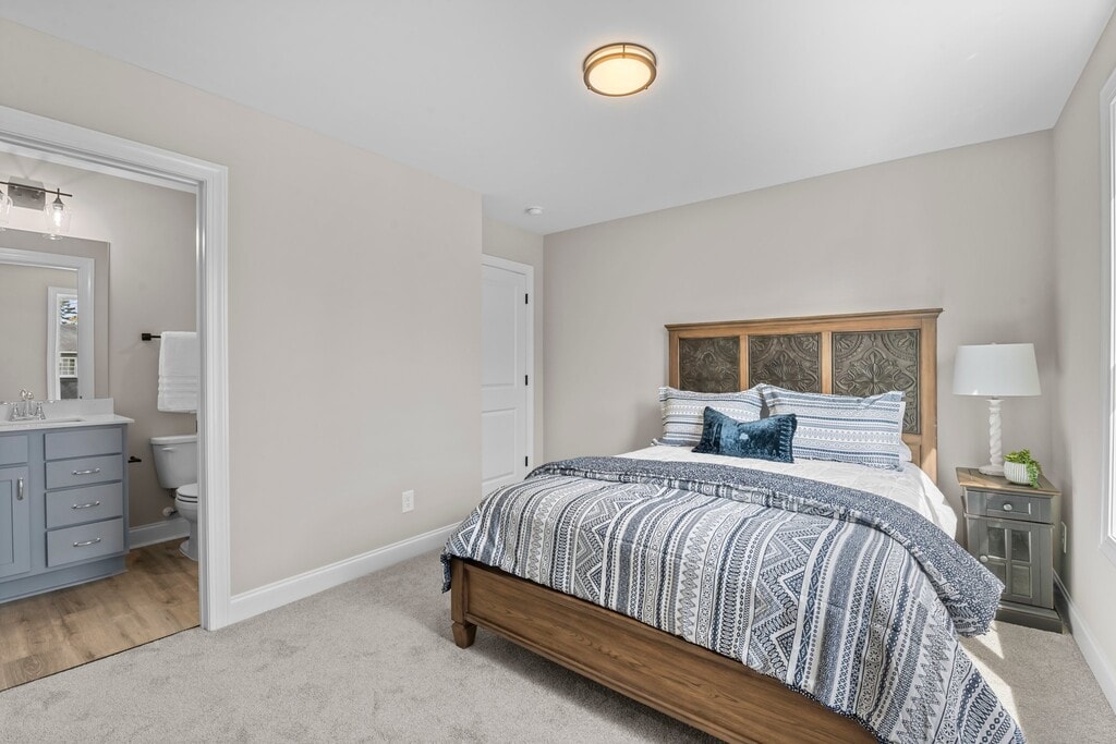 First floor private bedroom features huge walk in closet, queen bed, side table and desk! En suite has tub/shower combination vanity with quartz top and window for lots of natural light.