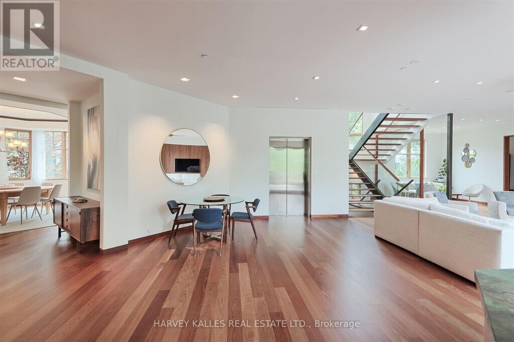 Discover a gem,custom-built as a multi-generational home,offering over 11,000 sq ft of luxurious living space on a rare 125ft double lot at the edge of the Humber Valley in the tree-lined Kingsway neighbourhood. This residence is a statement of contemporary elegance and sophistication,perfect for the discerning family.Inside,experience clean lines and exquisite details that enhance comfortable luxury living,including sound-isolated suites,Jatoba hardwood floors,stunning Persian serpentinite kitchen countertops,and heated stone floors for ultimate comfort.Accessibility is a key feature,with snow melt for the front porch,steps,ramp and driveway,a commercial 4x6 ft elevator,and 4 ft wide hallways to ensure effortless movement throughout the residence.The ground floor features a bright,open-plan living area that seamlessly integrates the chefs kitchen,dining,and living spaces,extending to a partially covered upper deck with a 17ft wide opening. A heated 3-car garage is cleverly positioned at the side of the house.The primary retreat is where luxury meets tranquility,featuring two generous walk-in closets and two ensuites one complete with a massage room and whirlpool tub offering tree-top views. Two additional spacious bedrooms,each with walk-in closets,share a thoughtfully designed bathroom suite with dual sinks,ample storage,and a separate area for added privacy. The oversized fourth bedroom also includes its own ensuite bathroom and walk-in closet,providing comfort and convenience for family or guests.The ground floor bedroom suite with a Juliet balcony offers a perfect retreat for guests.Venture to the finished lower level,where 10+ ft ceilings create a light and airy ambiance.This expansive space features a wide sliding door leading to the lower deck,ideal for entertaining.With multiple entertainment areas,including a stepped home theatre and sprawling park-like backyard,this home is designed for those who appreciate spacious comfort. (id:52069) ID#: 1417333