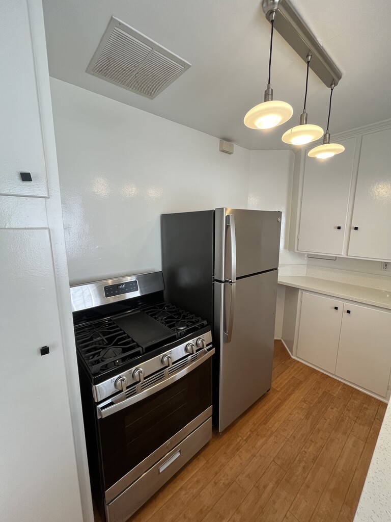 Private, quiet 1BR in a 7-unit building with refinished hardwood floors and great natural light. Updated kitchen with new quartz countertops, large bath, small patio, and private garage with storage. Walk to Montana Ave, shops, and Whole Foods.