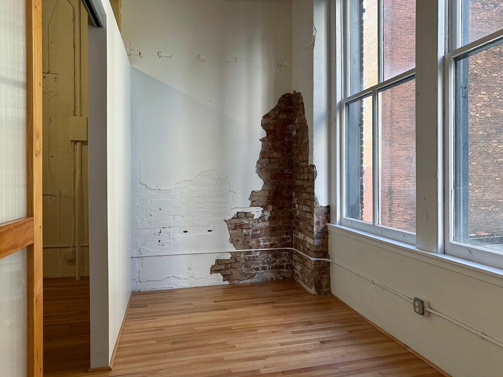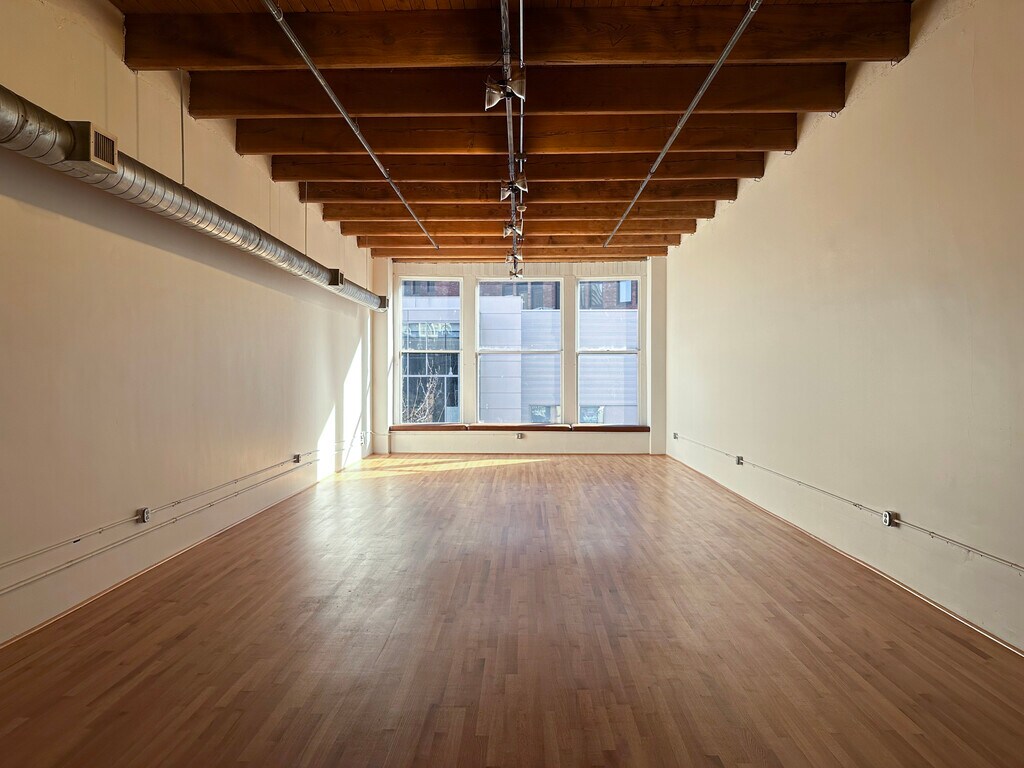 Work/live available in the Bruno Building, Downtown. Enormous bay windows looking down the length of Smithfield Street, high ceilings framed with deep wooden ceiling beams, white plastered walls, an open kitchen, full bath, and study/bedroom space in back with huge rear windows. A singular historic, warehouse building with live/work neighbors. Walking distance to every Downtown amenity, including the Cultural District, a bevy of restaurants, and just two short blocks to the river trail. Public transit right outside the door (the 28x flyer to the airport is just across the street). Bae Bae Cafe right downstairs.