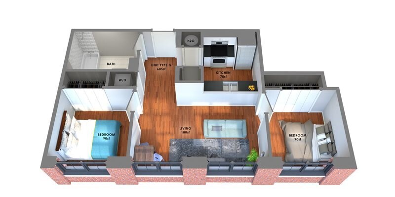 Apartment Model: 95 Lofts Floor Plan H$2,9502 Bedroom, 1 Bath, 738 sq ftAvailable Now![]()