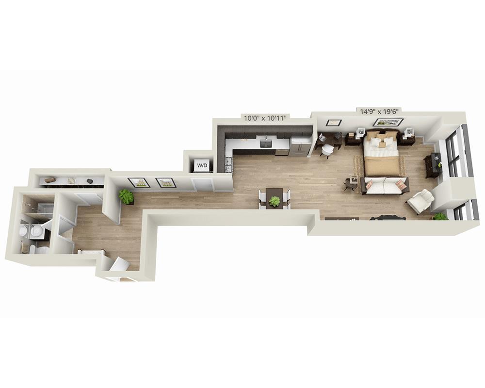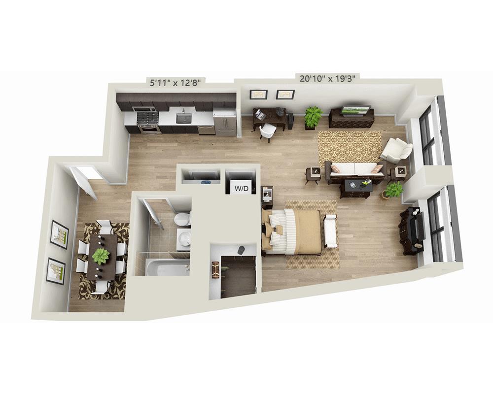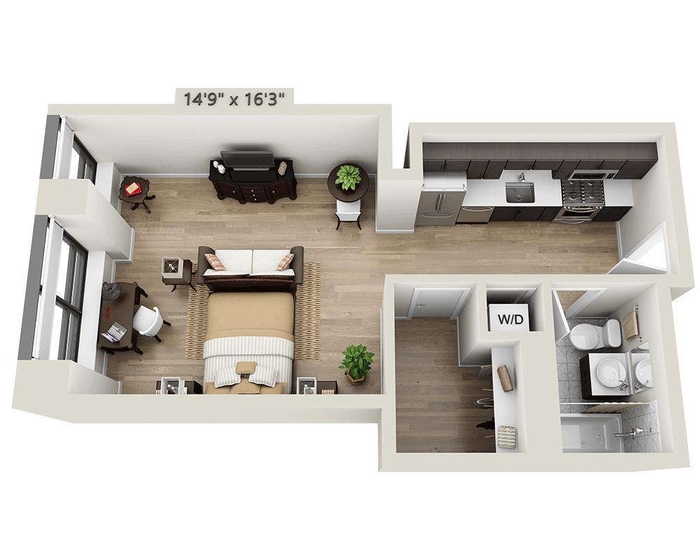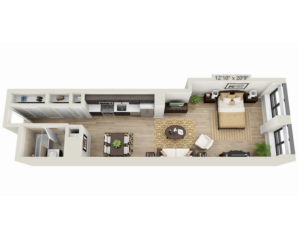 Studio E1YD - Floorplan 1 Apartment Unit: 01-208Apartment Model: Studio E1YD$3,996Studio, 1 Bath, 591 sq ftAvailable NowFloorplansPhotos![]()