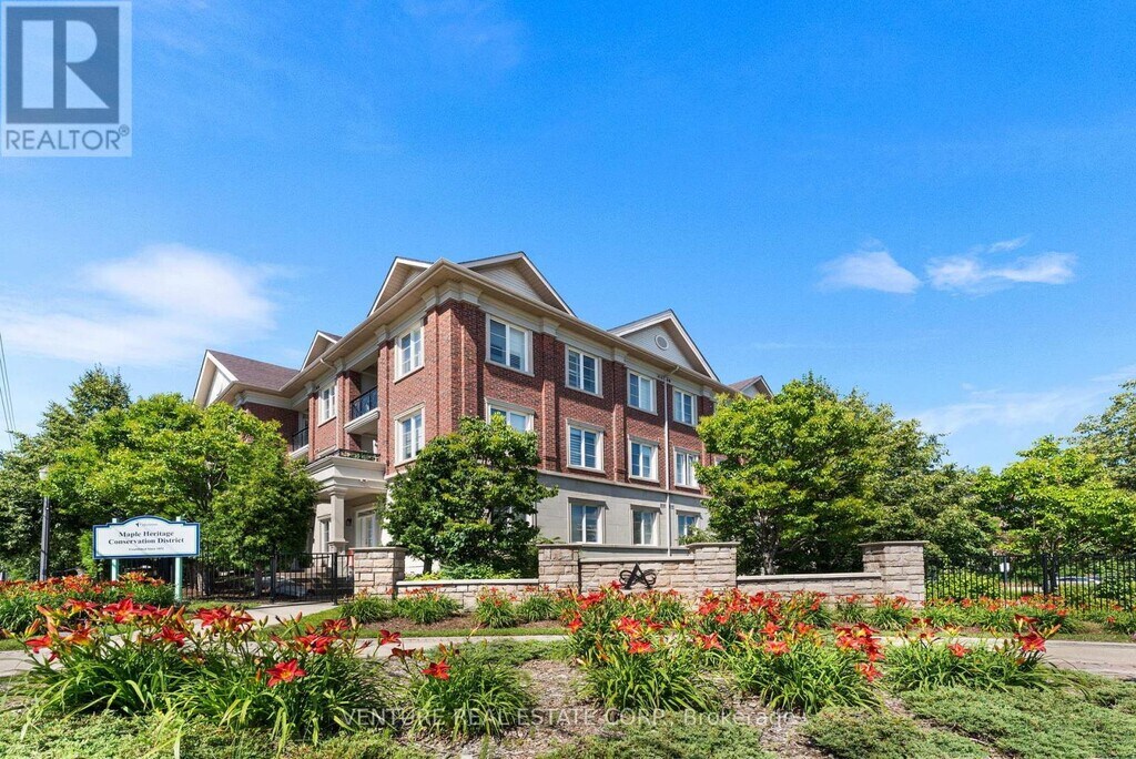 LOCATION LOCATION LOCATION...Located in the award-winning Amalfi Condos in Maple,this Sorrento III model offers a functional and well-designed layout overlooking the landscaped courtyard and water fountain. Situated in a boutique building,this spacious 2-bedroom (bedroom #2 with the closet is currently used as a sitting room),2-bathroom unit is filled with natural light and designed for comfortable living. The kitchen features full-sized appliances,ample cabinetry,and a breakfast bar,providing plenty of storage and prep space. The primary bedroom includes his and hers closets and a 3-piece ensuite. A laundry closet with a sink adds extra convenience,a rare feature in condo living. Parquet flooring runs throughout. A large balcony extends the living space,perfect for enjoying the outdoors. Includes one parking space and a locker. Excellent Building Amenities: Landscaped Courtyard Area,BBQ Area,Tables,Chairs,Benches,Bocce Court,Heated Indoor Pool,Sauna & Change Rooms,Exercise Room,Lounge/Party Billiard. Visitors Parking Interior and Exterior. LOCATION LOCATION LOCATION Proximity to Public Transit (Go Station) Subway,Hwy 400,407,Vaughan Mills,Canada's Wonderland,Churches,Schools,Cortelucci Regional Hospital,Parks,Recreation facilities plus much more. A great opportunity in a sought-after building! (id:52069) ID#: 1407164