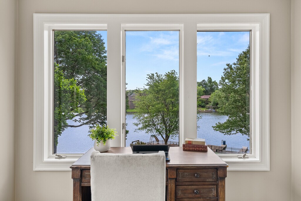Escape to lakeside living on Garner Lake! With $140K+ in updates, this stunning 5 bed, 3.5 bath home offers unbeatable lake views from nearly every room on a beautifully landscaped 0.48-acre lot. The remodeled kitchen features updated soft-close cabinets, new hardware, backsplash, and a drink fridge. Refinished hardwoods flow through the vaulted great room with skylights and a grand stone fireplace. The main-level primary suite is a true retreat with lake views ,its own fireplace, and a spa-worthy bath with soaking tub, expanded body-spray shower, new vanity, quartz counters, lighting, and flooring. The walk-out lower level includes a guest suite and sauna. Upstairs offers 3 bedrooms, a home office, and an updated full bath with new tub, tile surround, and flooring. Outside, enjoy a large yard, multiple entertaining areas, and an extended dock that spans the width of the lot. Located in a vibrant lake community, this home blends luxury, comfort, and the ultimate lakefront lifestyle!