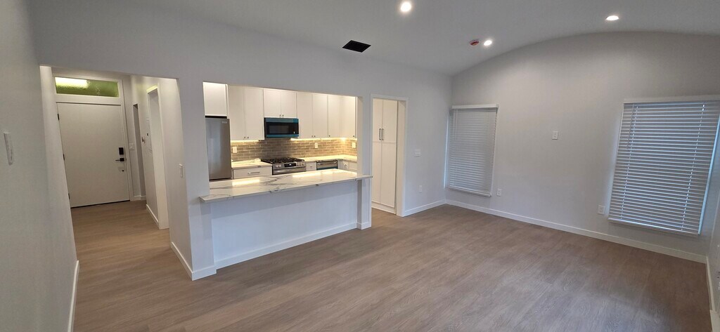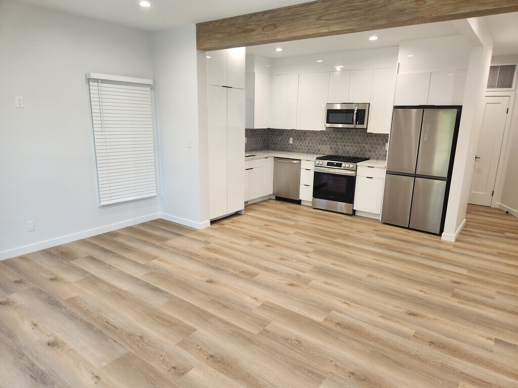 Brand new gut renovated unit. Kitchen includes high-end stainless steel appliances and in-unit washer and dryer. Light oak color floors flow seamlessly throughout the living areas, with high-end insulation for privacy and quiet living, tons of natural light, and high ceilings. Located on a quiet tree-lined street in Beverly Hills, walking distance to restaurants, shopping, and hotels.