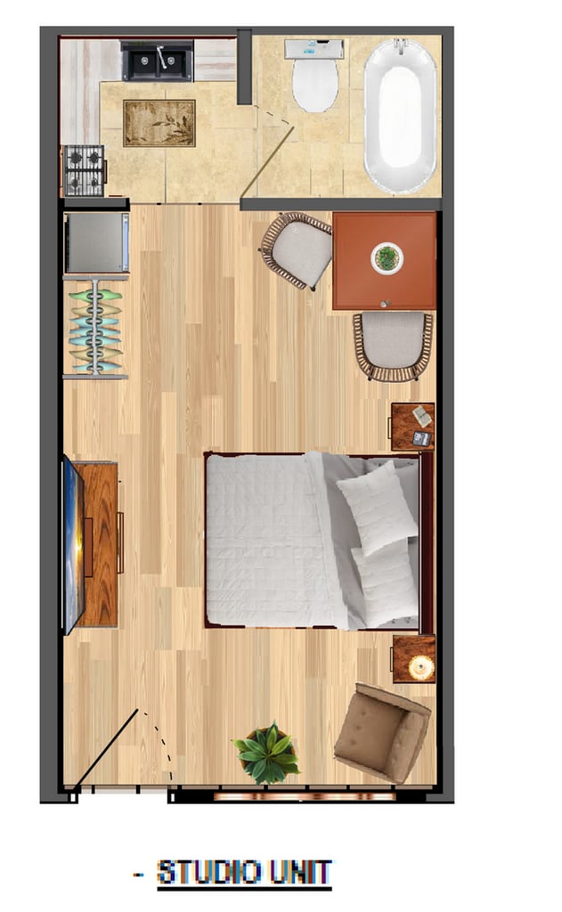 Efficiency unit consists of Living Room Kitchen Bedroom 1 Full Bathrooms 308 sq. ft.