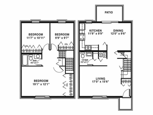 Two Bedroom One and a Half Bath - Floorplan 1 3 Bedrooms