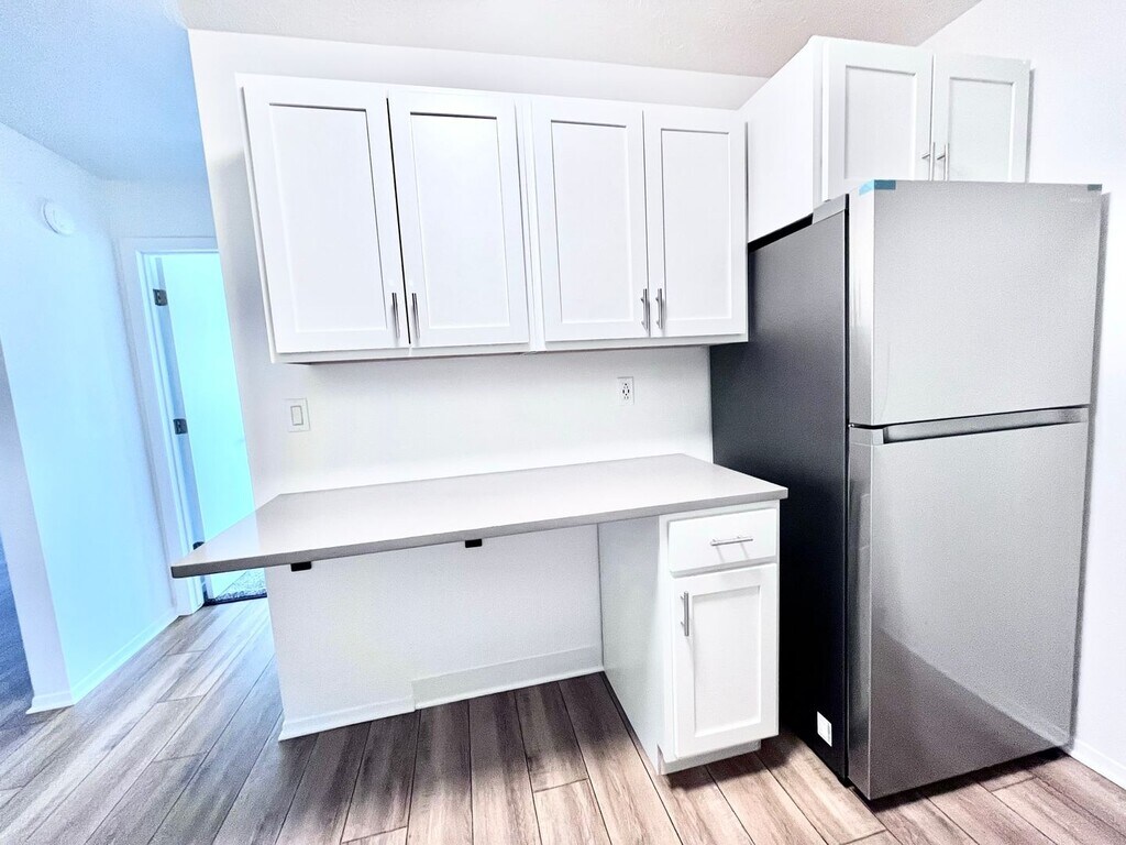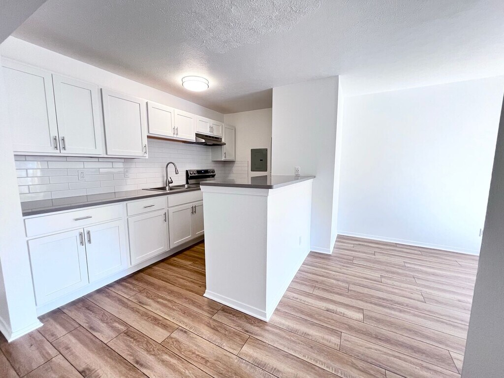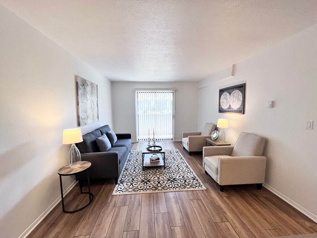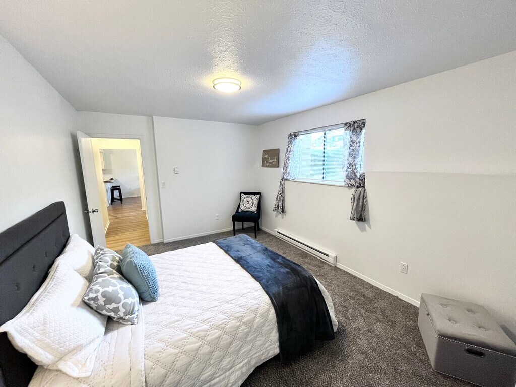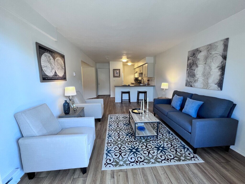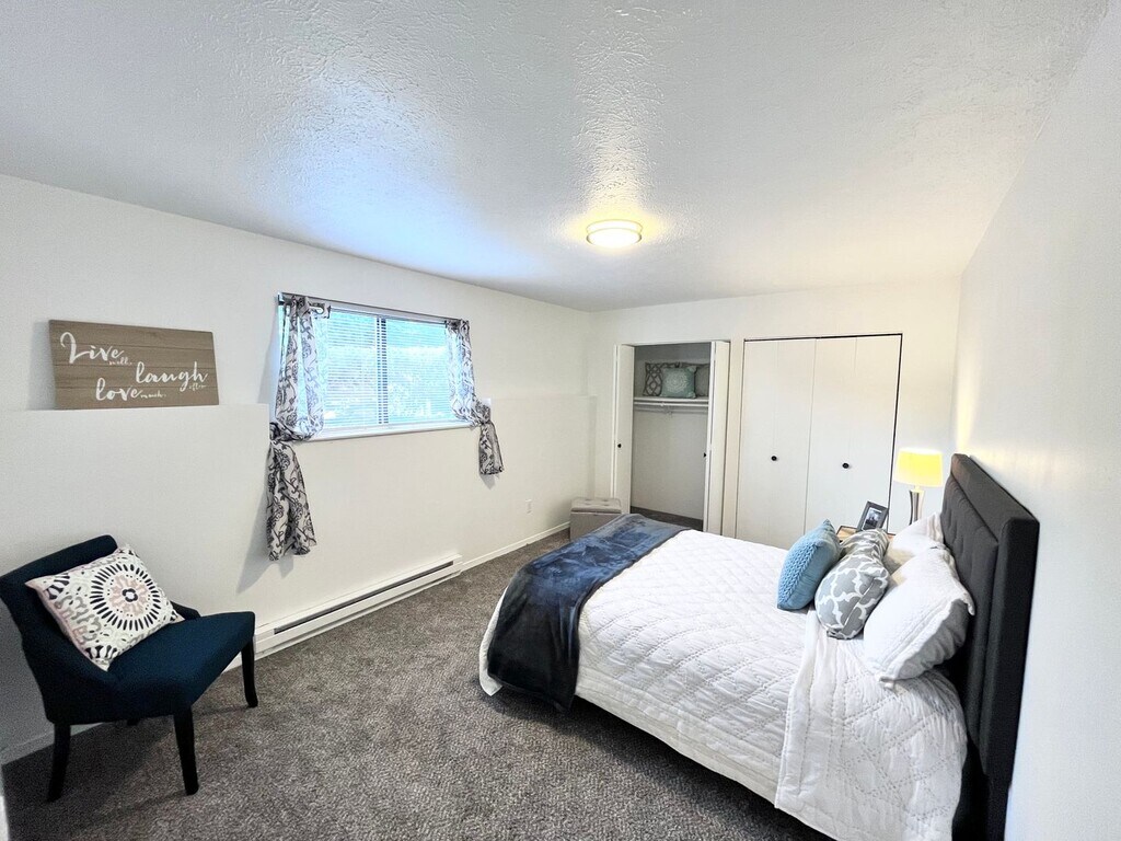 Remodeled one-bedroom one-bathroom apartment The kitchen updates include stainless steel appliances (fridge and stove), over-the-range microwave, solid quartz or HD countertops, eat-in peninsula with counter stool height seating, subway tile backsplash, deep double kitchen sinks with spray hose and nozzle, and garbage disposal. The bedroom has plush carpet - all other areas have gorgeous LVP flooring. There is LED lighting throughout the building hallways and apartments. Comfort-height toilet, refinished bathtubs with new brushed nickel hardware, and large walk-in closets. Note: This specific apartment does not have a patio or balcony. Please take note of the following details: - $75.00 Admin Fee per month covers water, sewer, trash, and gas for hot water. - $25.00 Pet Rent per month, per pet. - $250.00 One-Time Non-Refundable Pet Fee. - $40.00 Application Fee. - Tenants are responsible for putting electric and cable (optional) in their name. - Liability insurance is required. You can use AppFolio or your own insurance company.