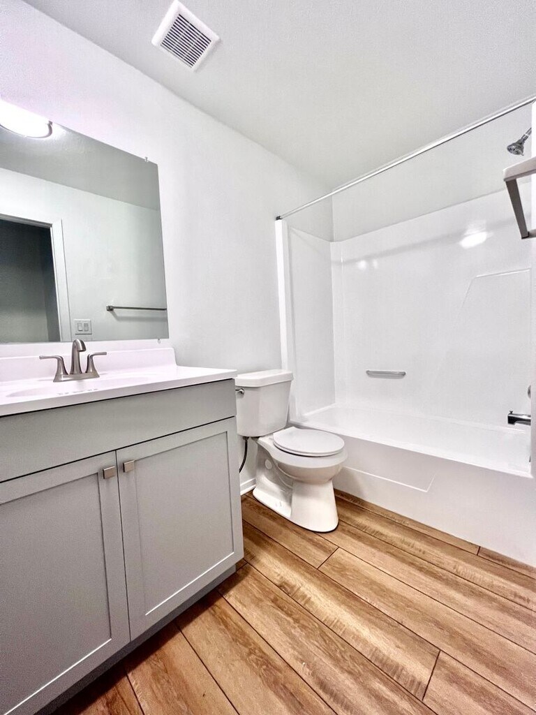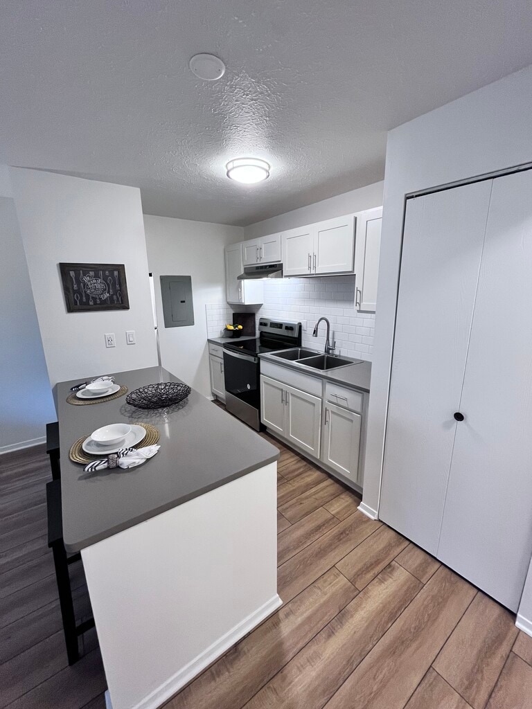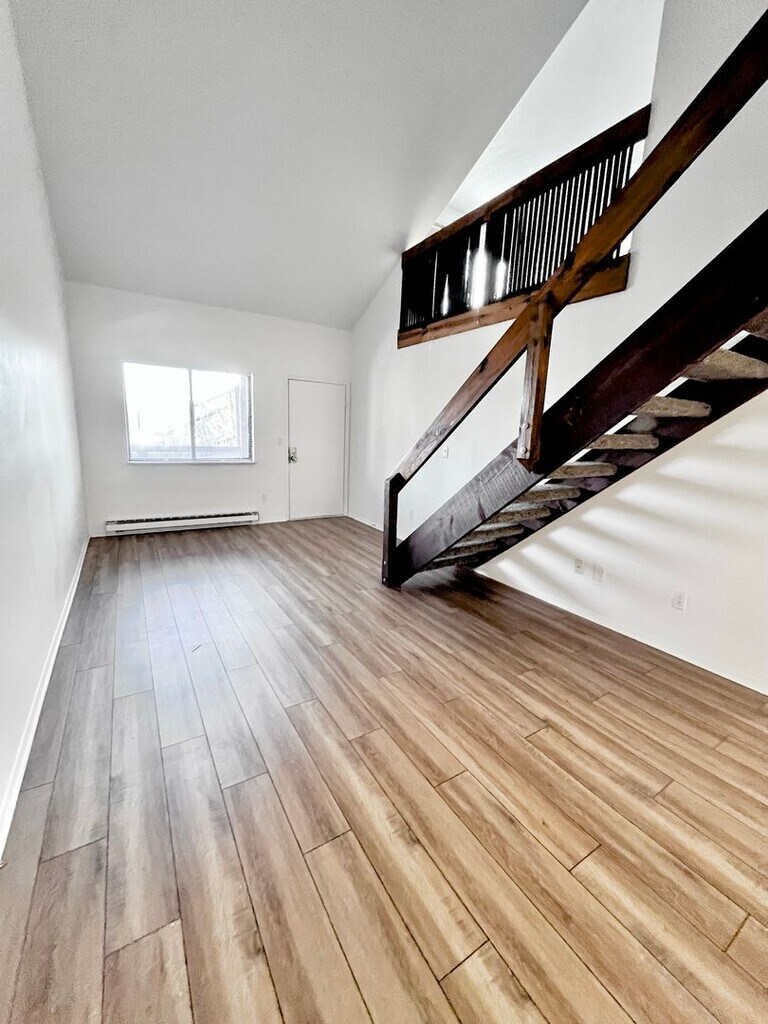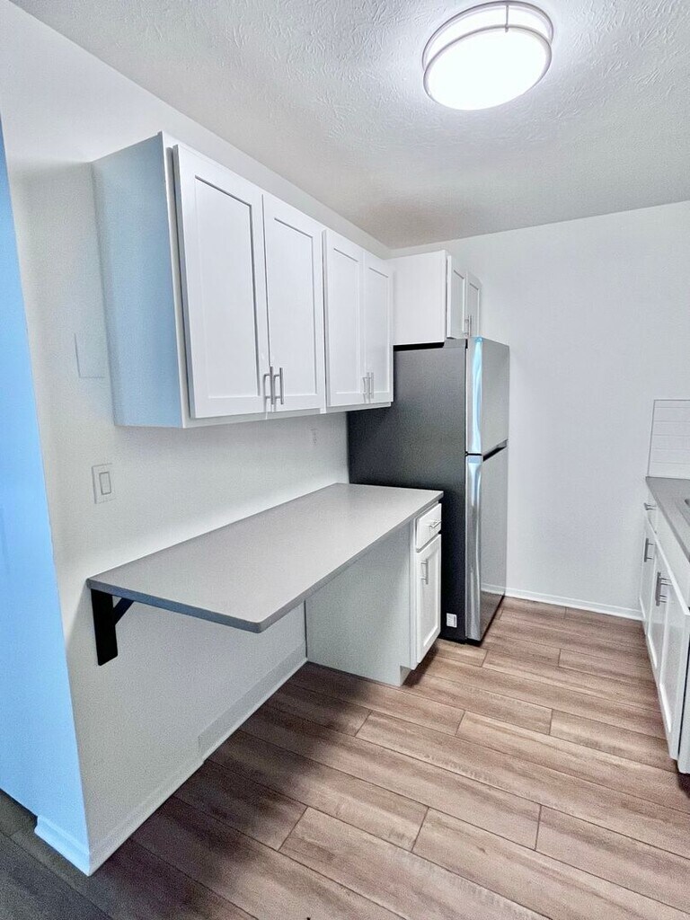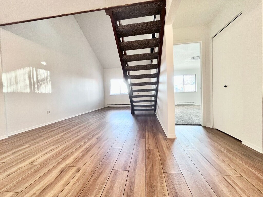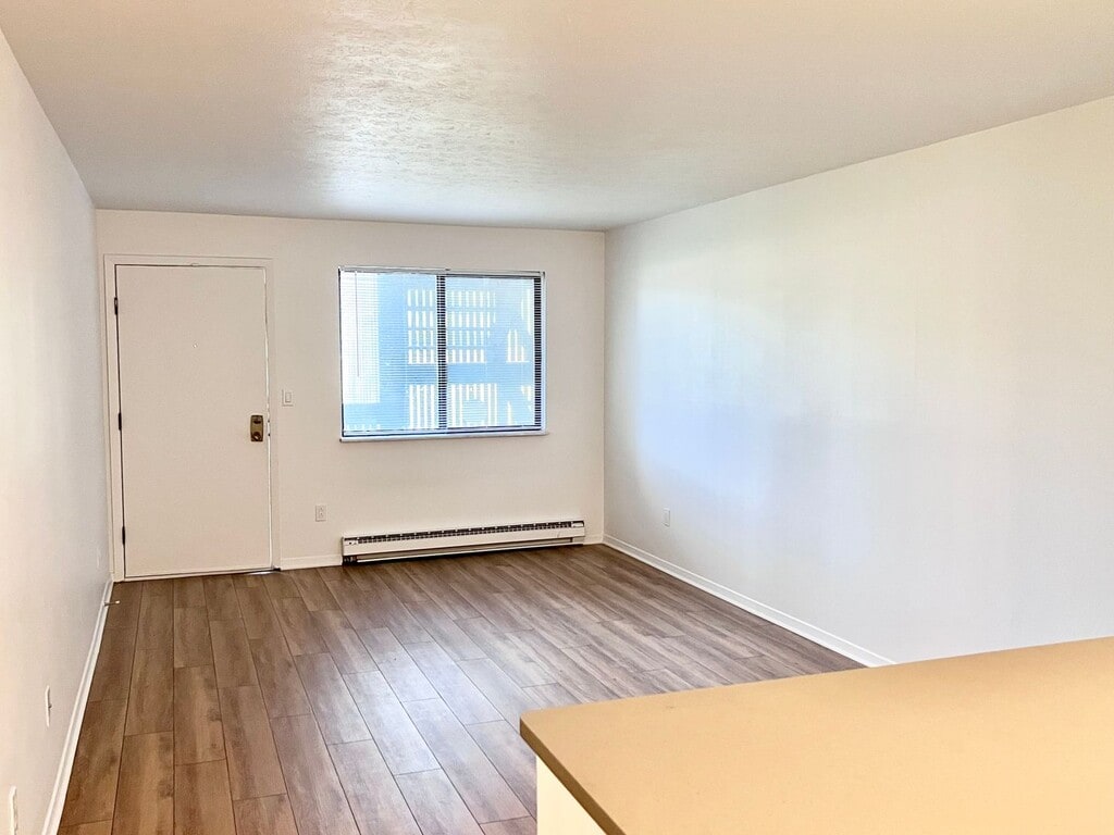 Remodeled one-bedroom one-bathroom apartment The kitchen updates include stainless steel appliances (fridge and stove), over-the-range microwave, solid quartz or HD countertops, eat-in peninsula with counter stool height seating, subway tile backsplash, deep double kitchen sinks with spray hose and nozzle, and garbage disposal. The bedroom has plush carpet - all other areas have gorgeous LVP flooring. There is LED lighting throughout the building hallways and apartments. Comfort-height toilet, refinished bathtubs with new brushed nickel hardware, and large walk-in closets. Note: This specific apartment does not have a patio or balcony. Please take note of the following details: - $75.00 Admin Fee per month covers water, sewer, trash, and gas for hot water. - $25.00 Pet Rent per month, per pet. - $250.00 One-Time Non-Refundable Pet Fee. - $40.00 Application Fee. - Tenants are responsible for putting electric and cable (optional) in their name. - Liability insurance is required. You can use AppFolio or your own insurance company.