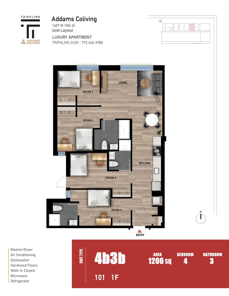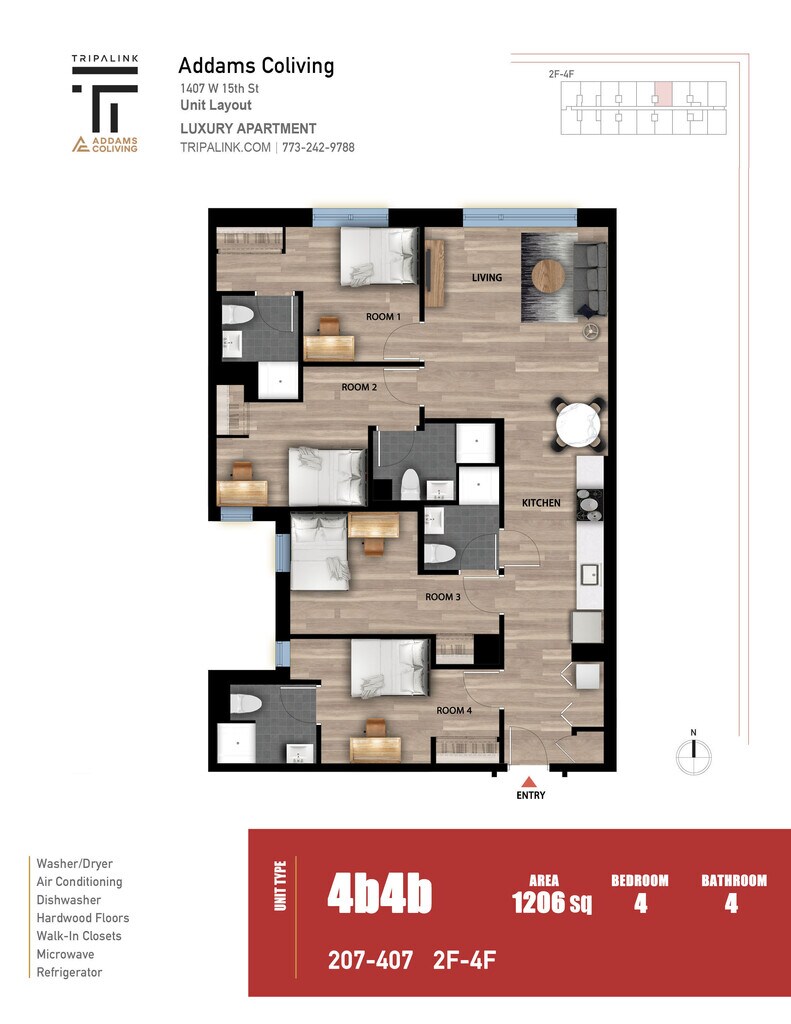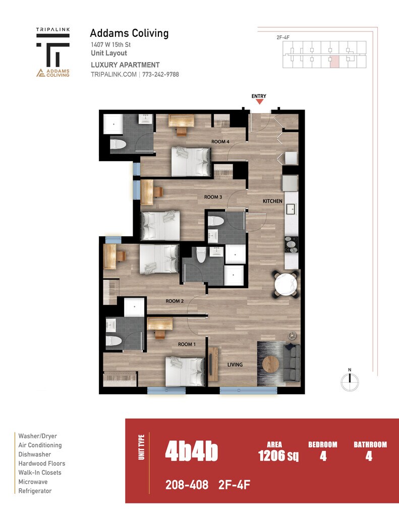 Addams Coliving offers 2 to 4 Bedroom apartments starting from $1,160 and having 118–1,277 sq ft. Here is the current pricing and availability: