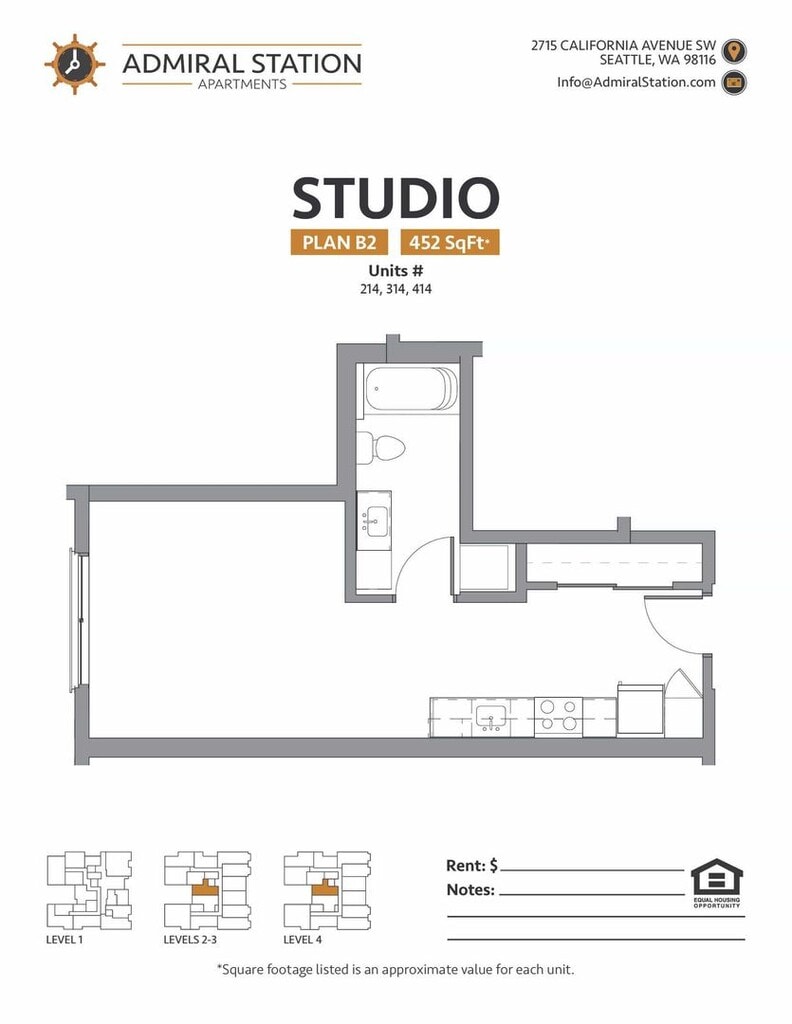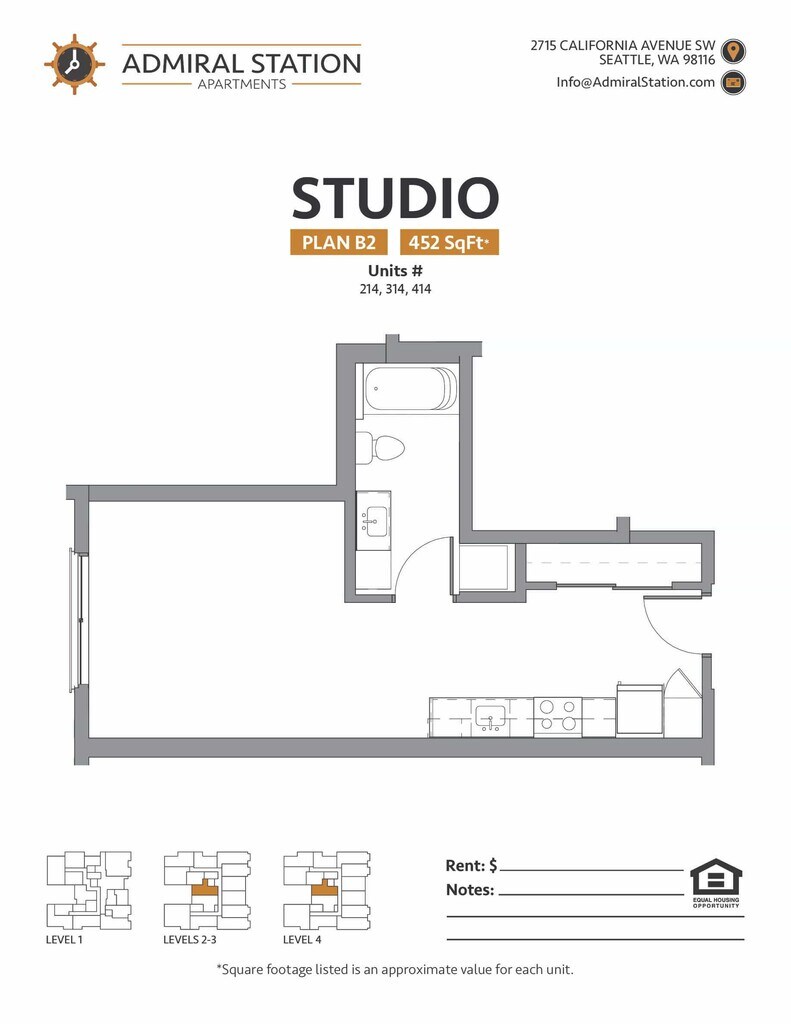 Admiral Station Apartments offers Studio to 1 Bedroom apartments starting from $1,750 and having 452–523 sq ft. Here is the current pricing and availability: