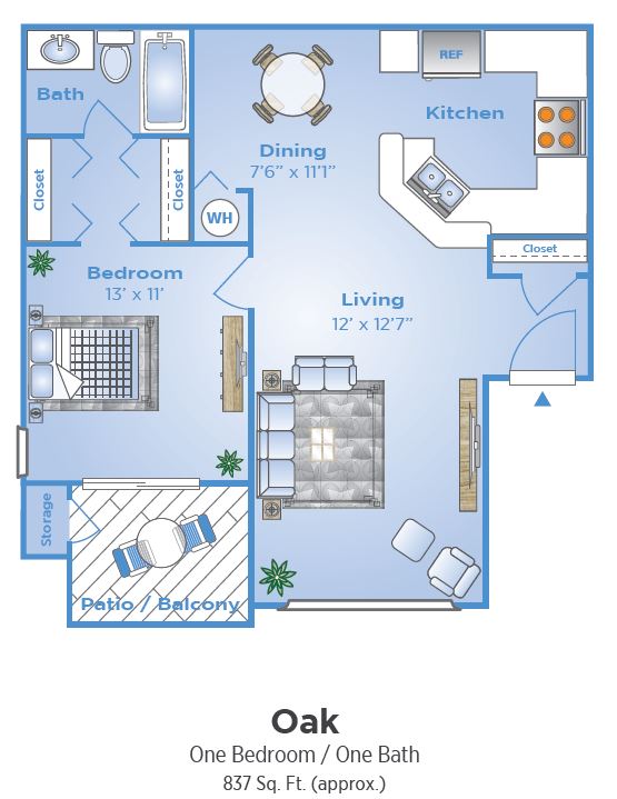 Apartment Model: OakFrom $1,5491 Bedroom, 1 Bath, 784 sq ftAvailable Now![]()