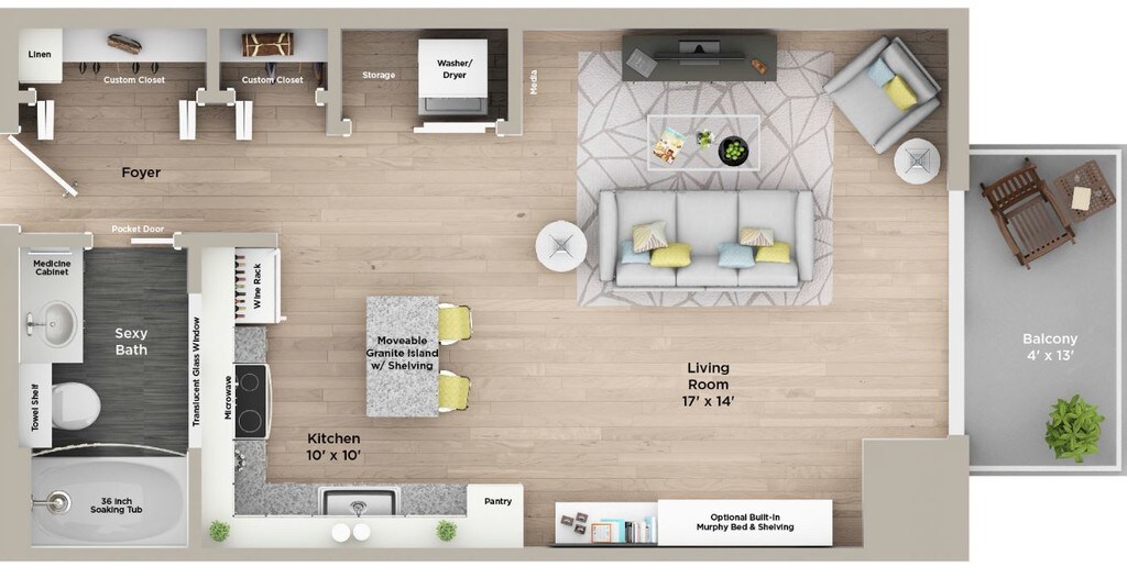 Apartment Model: SNFrom $1,675Studio, 1 Bath, 402 sq ftAvailable January 13, 2026Floor plans are artist's rendering. All dimensions are approximate. Actual product and specifications may vary in dimension or detail. Not all features are available in every rental home. Prices and availability are subject to change. Base rent is based on monthly frequency. Additional fees may apply, such as but not limited to package delivery, trash, water, amenities, etc. Deposits vary. Please see a representative for details.