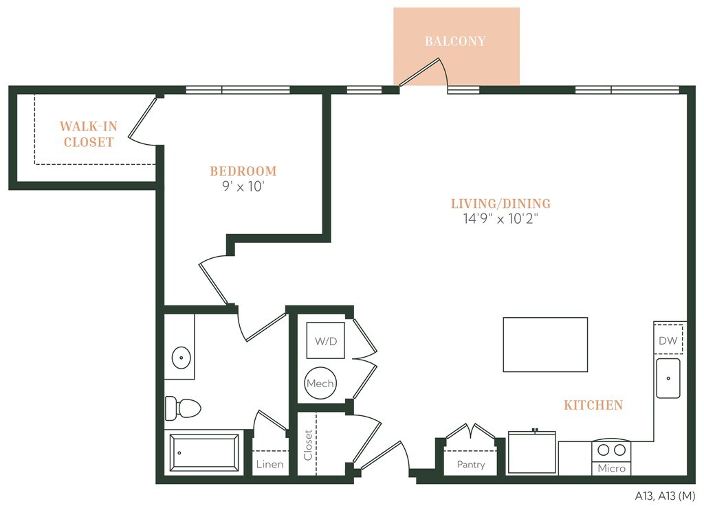 A13 - Floorplan 1 Apartment Unit: 1308Apartment Model: A131 Bedroom, 1 Bath, 820 sq ftAvailable NowApartment Unit: 1408Apartment Model: A131 Bedroom, 1 Bath, 820 sq ftAvailable NowFloorplan A15