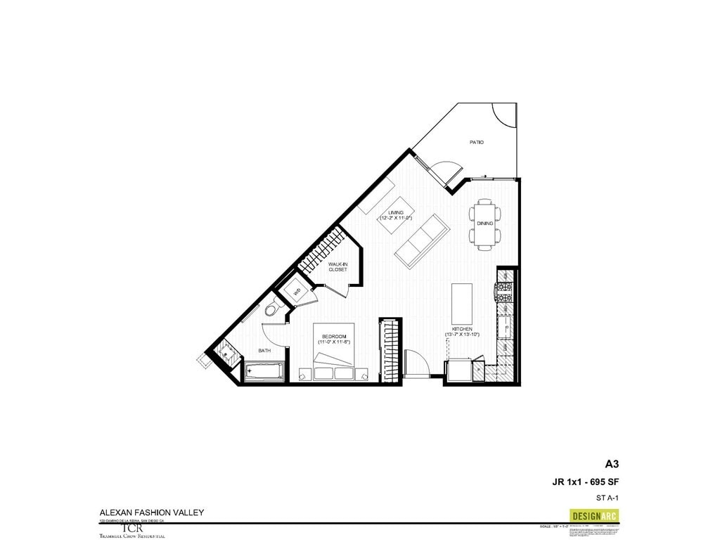 A1A1 Jr 1x1 - Floorplan 1 Floor plans are artist's rendering. All dimensions are approximate. Actual product and specifications may vary in dimension or detail. Not all features are available in every rental home. Prices and availability are subject to change. Base rent is based on monthly frequency. Additional fees may apply, such as but not limited to package delivery, trash, water, amenities, etc. Deposits vary. Please see a representative for details.