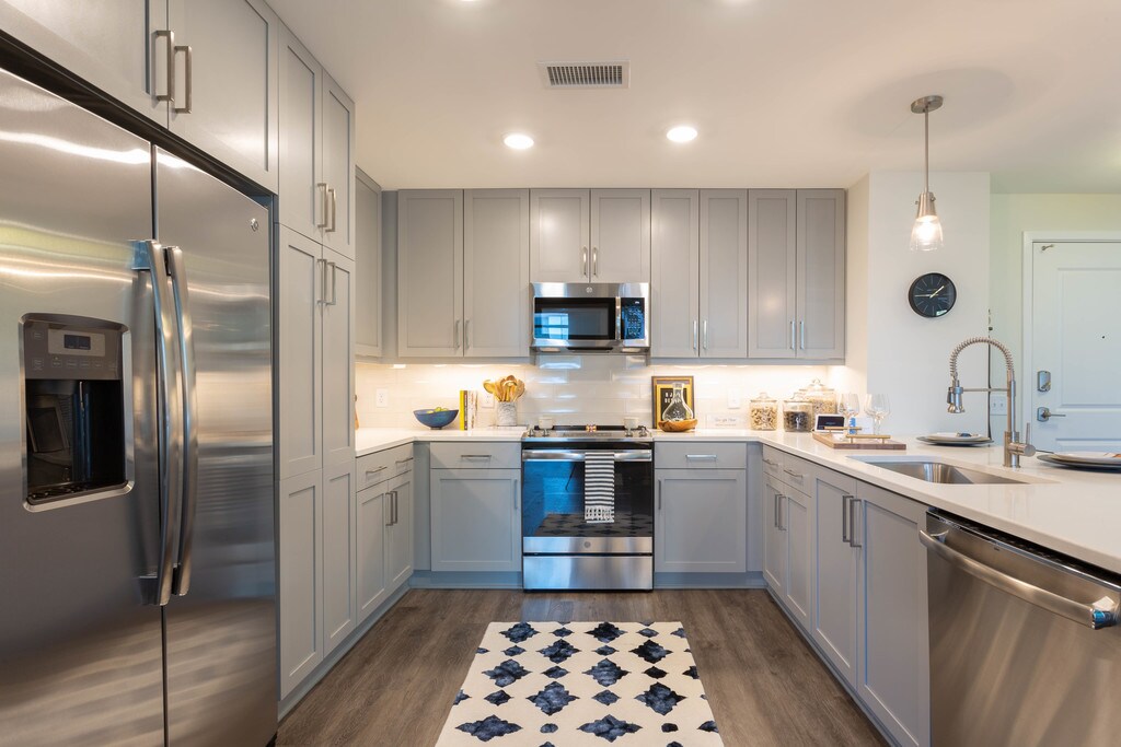 - Premium Quartz Countertops, Tile Backsplashes and Under-Mount Sinks with Pull-Down Faucets